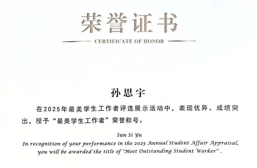 我校辅导员孙思宇凭借扎实的专业知识和丰富的实践经验,在各个环节中都有着出色的表现。尤其是在班情熟知环节,取得了满分成绩,充分展现了他对学生情况的深入了解和细致关怀。最终,孙思宇从45名参评辅导员中脱颖而出,荣获“2025年最美学生工作者”荣誉称号。