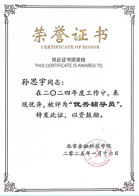 此次获奖,不仅是他个人的荣耀,更是北京金融科技学院的骄傲。他的事迹将激励着更多的学工人员以他为榜样,不断提升自己的专业素养和综合能力,为学生的成长和发展贡献自己的力量。