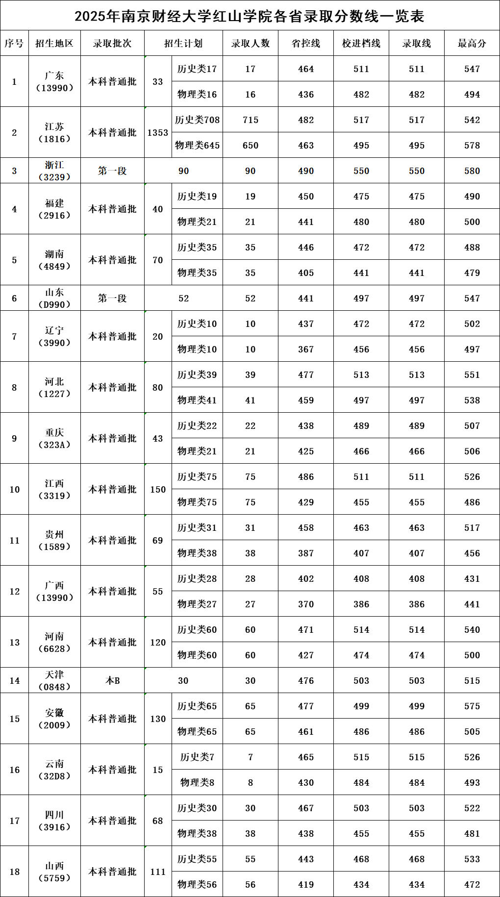 2025年南京财经大学红山学院各省录取分数线一览表