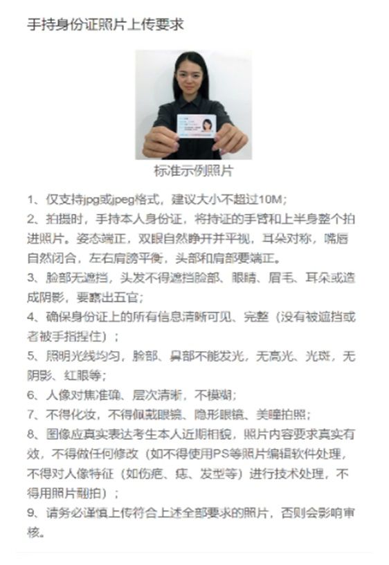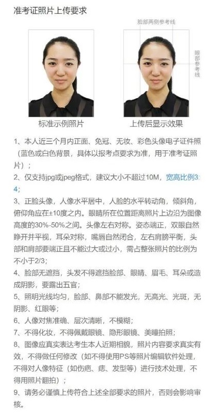 注:以上照片,请不要化妆,不得佩戴眼镜、隐形眼镜、美瞳拍照;照明光线均匀,脸部不能发光,无高光、光斑,无阴影、红眼等;头发不得遮挡脸部或造成阴影,要露出五官,并能如实地反映本人近期相貌(未经过PS等照片编辑软件处理,不得拿照片翻拍)。
