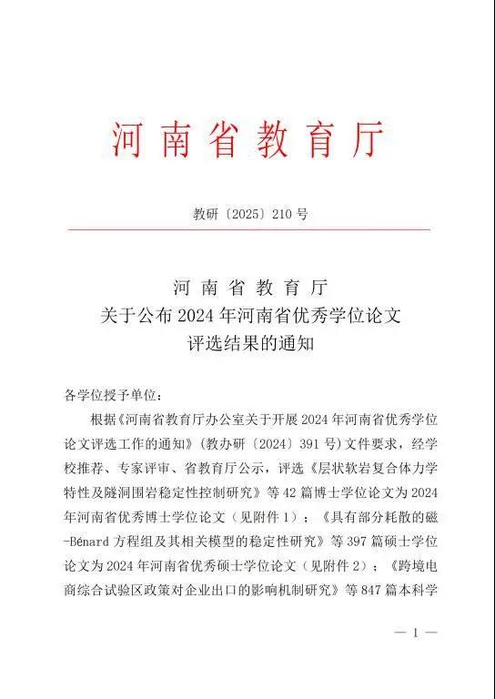 近日,河南省教育厅公布2024年河南省优秀学位论文评选结果(教研〔2025〕210号),郑州科技学院推荐的21篇校级本科毕业设计(论文)中有20篇被评为“2024年河南省优秀学士学位论文”,优秀率为95.24%,居河南省民办高校首位。