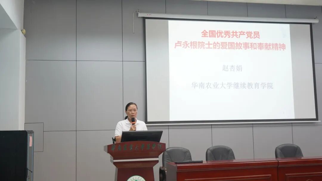 为深化同学们对卢永根院士崇高精神的理解,本次活动特别举办了卢永根院士事迹报告会。卢永根院士生前秘书、华南农业大学赵杏娟老师以真挚的情感,从爱国、科研、奉献三个维度,深情讲述了卢院士毕生奉献农业科研、捐尽积蓄助教、捐献遗体科研的感人事迹。