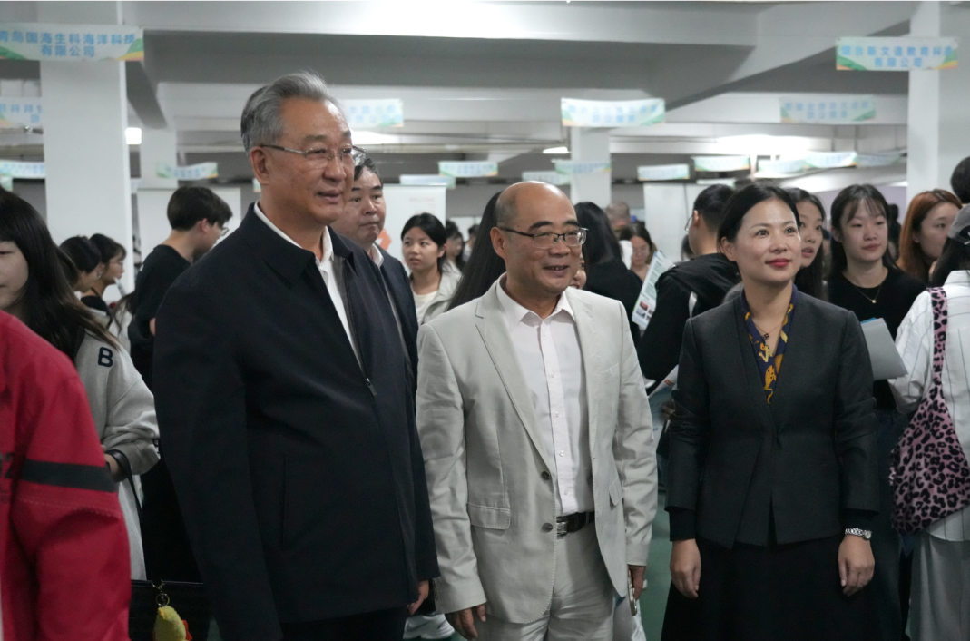 学校董事长、校长胡剑锋,党委书记王少鹏,烟台市公共就业和人才服务中心党委书记、主任丁智一行,烟台市黄渤海新区人社局党组成员、副局长崔荣坤一行,蓬莱区人社局党组成员、区公共就业和人才服务中心主任张良栋一行,以及副校长左振华、郑苏生、高菁、王凤丽,在有关部门负责同志的陪同下深入两校区双选会现场,与用人单位代表进行交流,并与毕业生亲切交谈,了解就业意愿和求职进展情况。