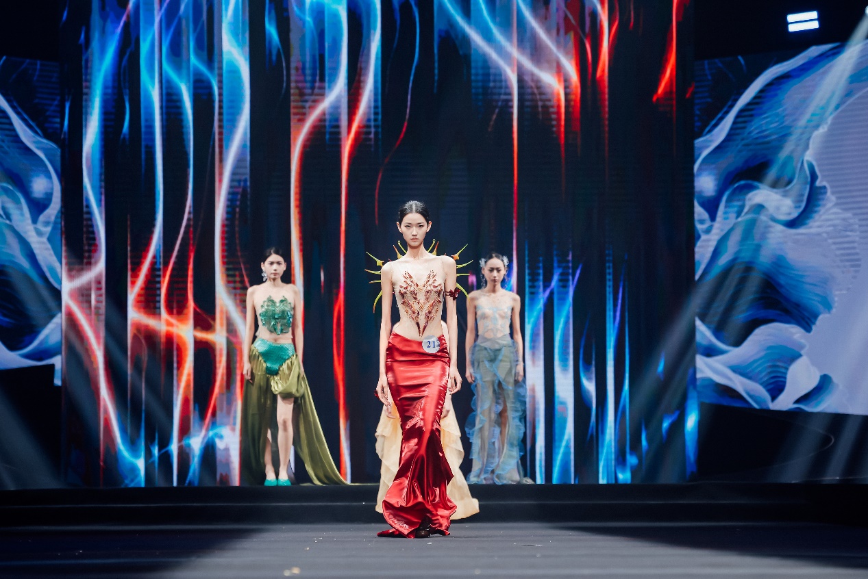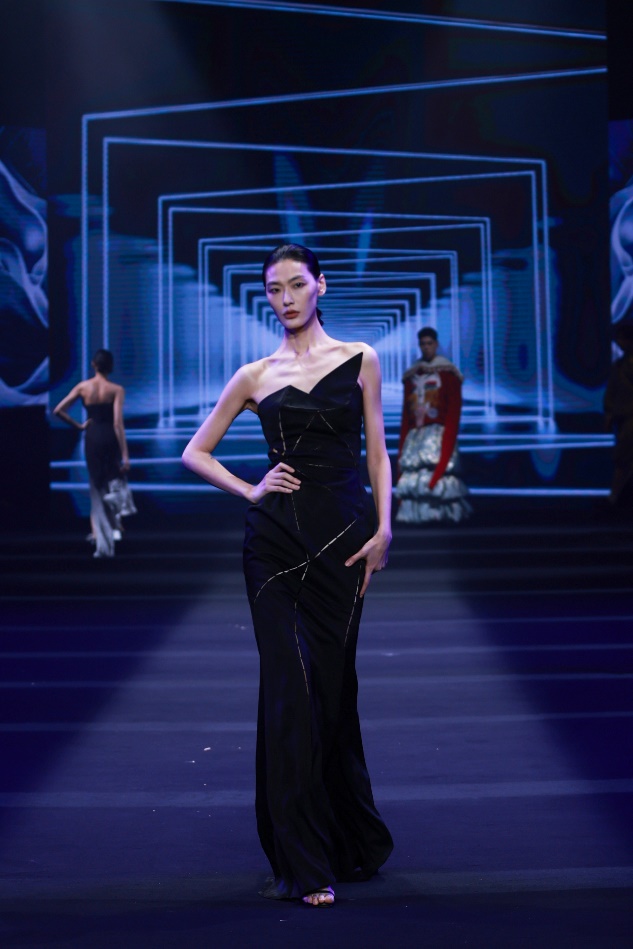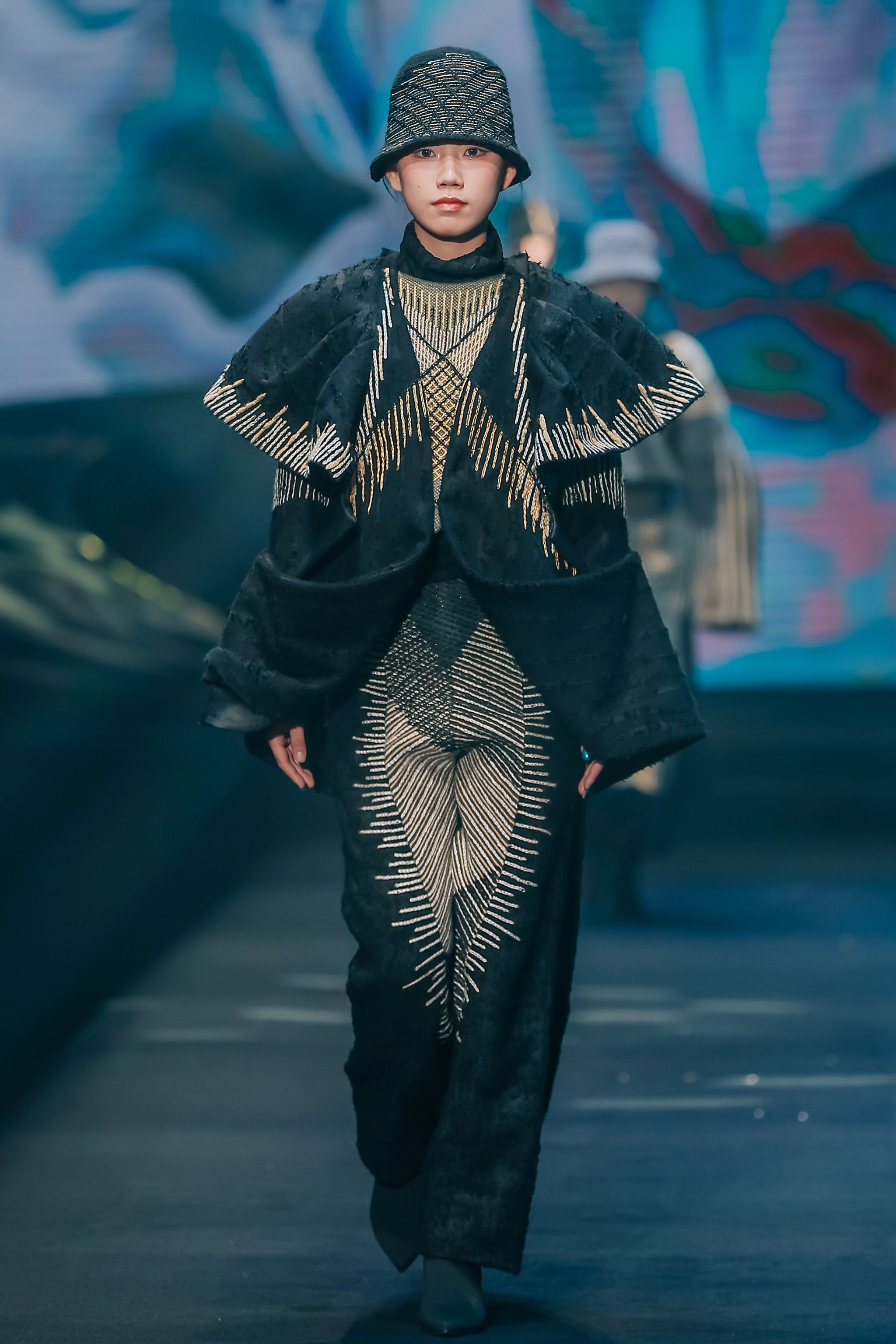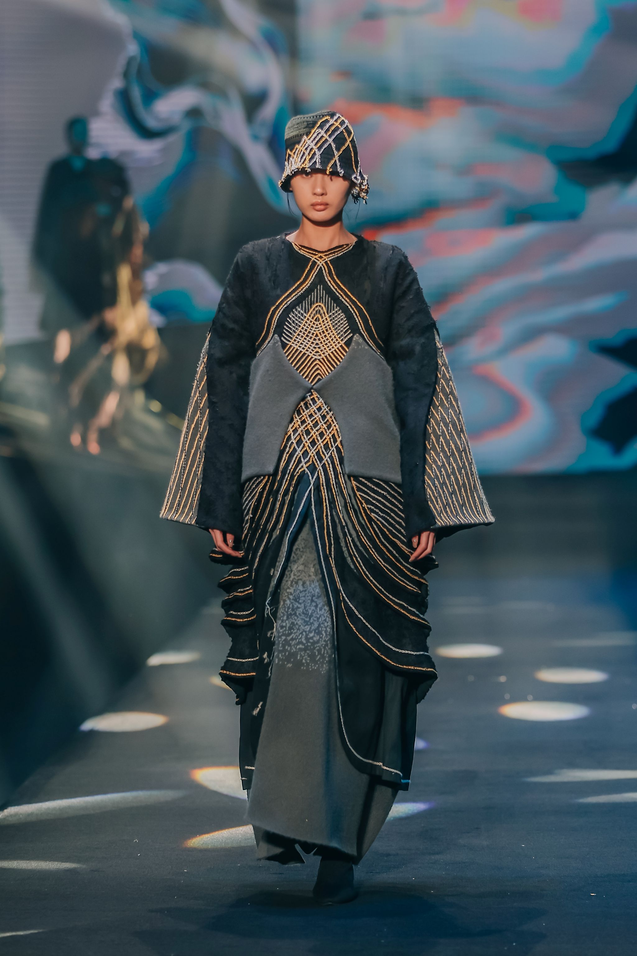 霓裳光影,盛宴同赏,在模特们的精彩演绎与选手视频回放下,30组入围决赛的优秀作品依次亮相,设计师们以创意为笔、以文化为墨,将中国传统美学与域外文化元素巧妙融合,既有对吉兰丹蜡染等非遗技艺的创新活化,也有科技与手工碰撞的立体剪裁呈现,充分诠释了“和”主题下的多元设计表达。本届大赛共收到国内外90余所高校1385份参赛作品,经过层层选拔与公证机关全程监督的终审环节,最终评选出各类奖项,彰显了赛事的专业性与公正性。