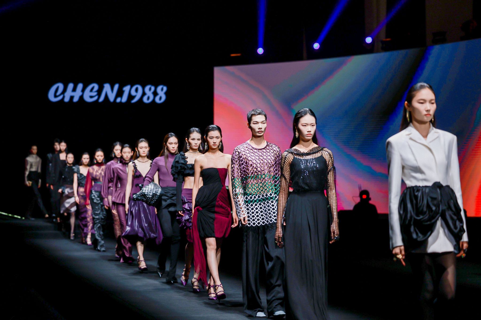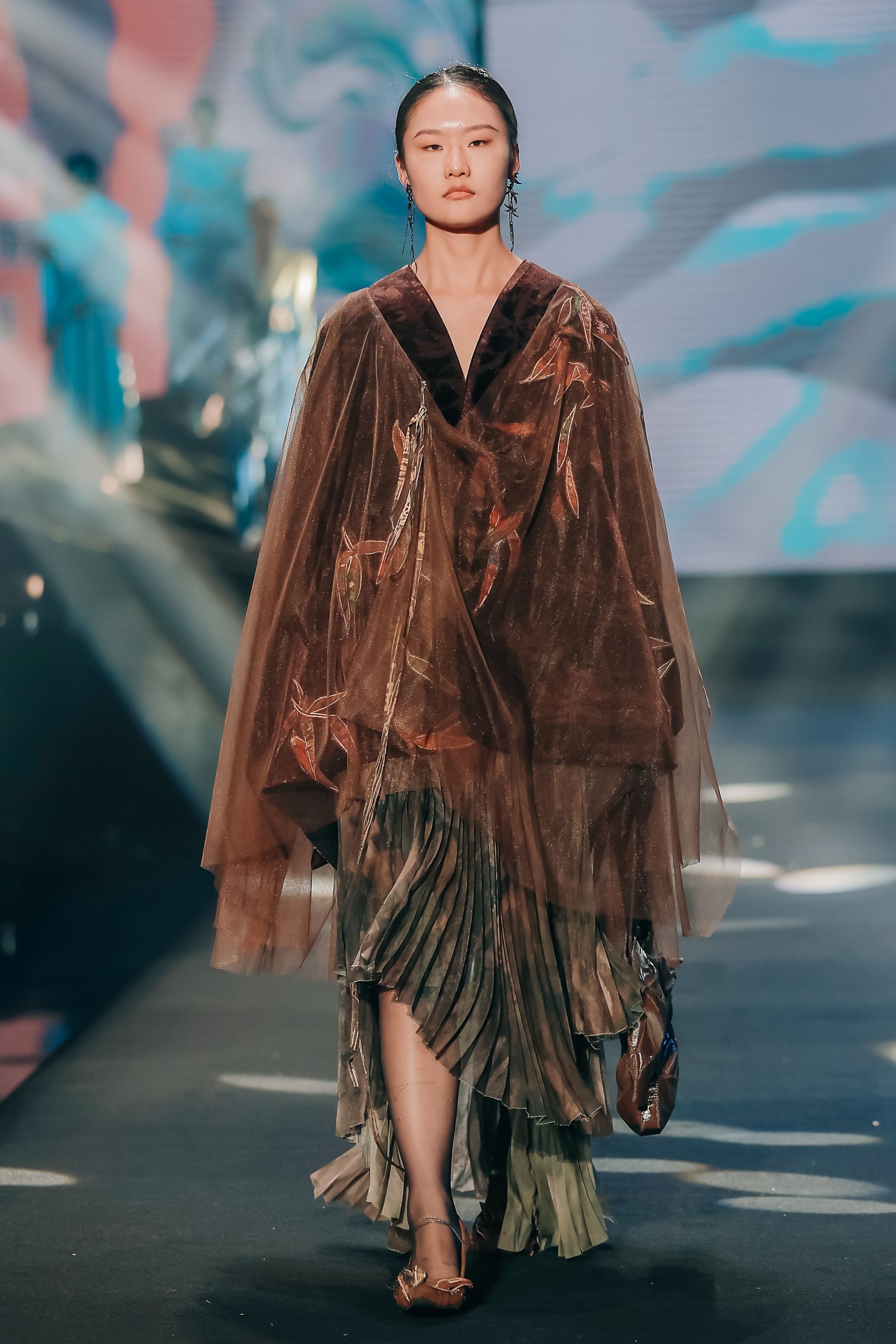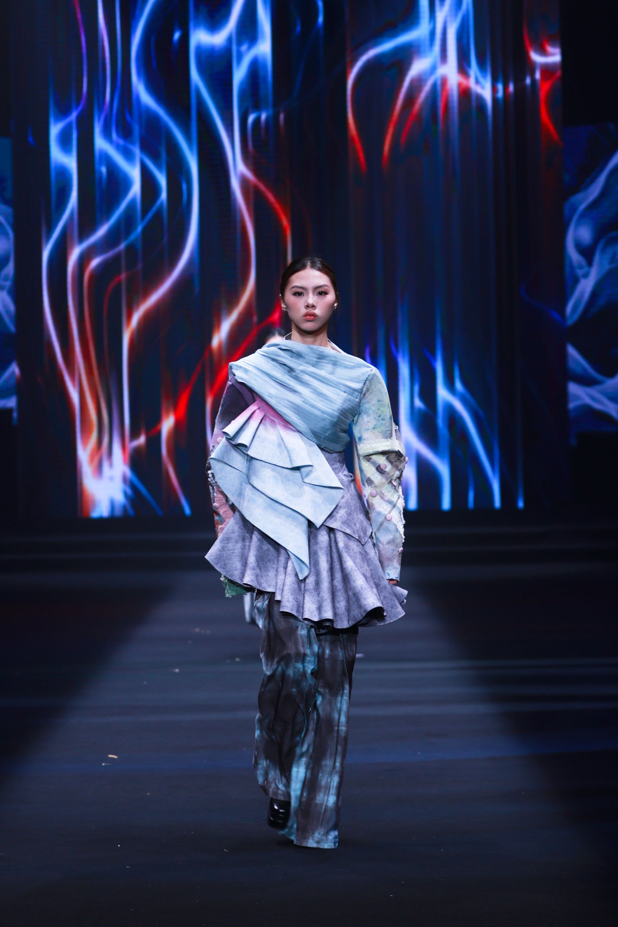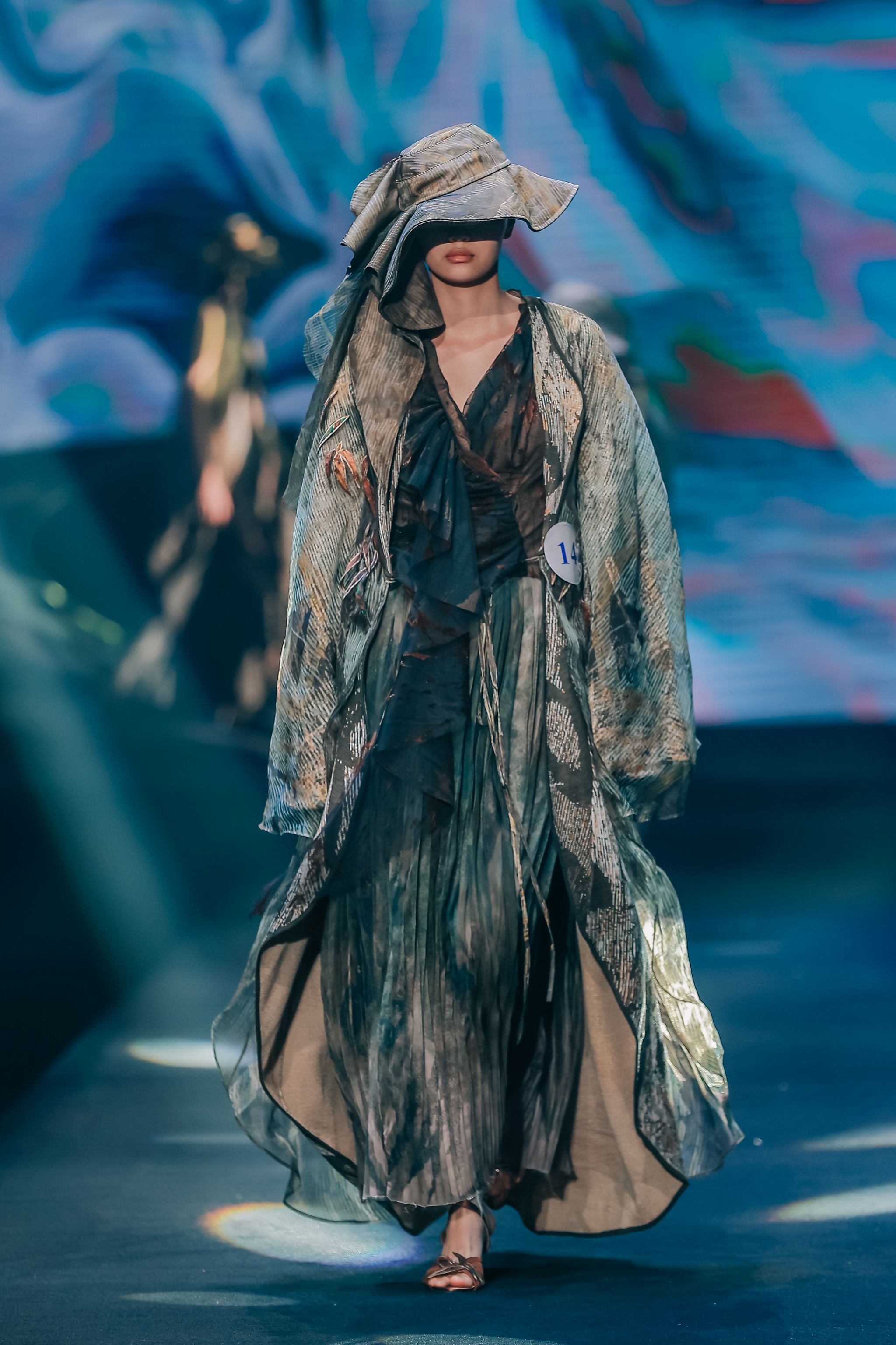 霓裳光影,盛宴同赏,在模特们的精彩演绎与选手视频回放下,30组入围决赛的优秀作品依次亮相,设计师们以创意为笔、以文化为墨,将中国传统美学与域外文化元素巧妙融合,既有对吉兰丹蜡染等非遗技艺的创新活化,也有科技与手工碰撞的立体剪裁呈现,充分诠释了“和”主题下的多元设计表达。本届大赛共收到国内外90余所高校1385份参赛作品,经过层层选拔与公证机关全程监督的终审环节,最终评选出各类奖项,彰显了赛事的专业性与公正性。