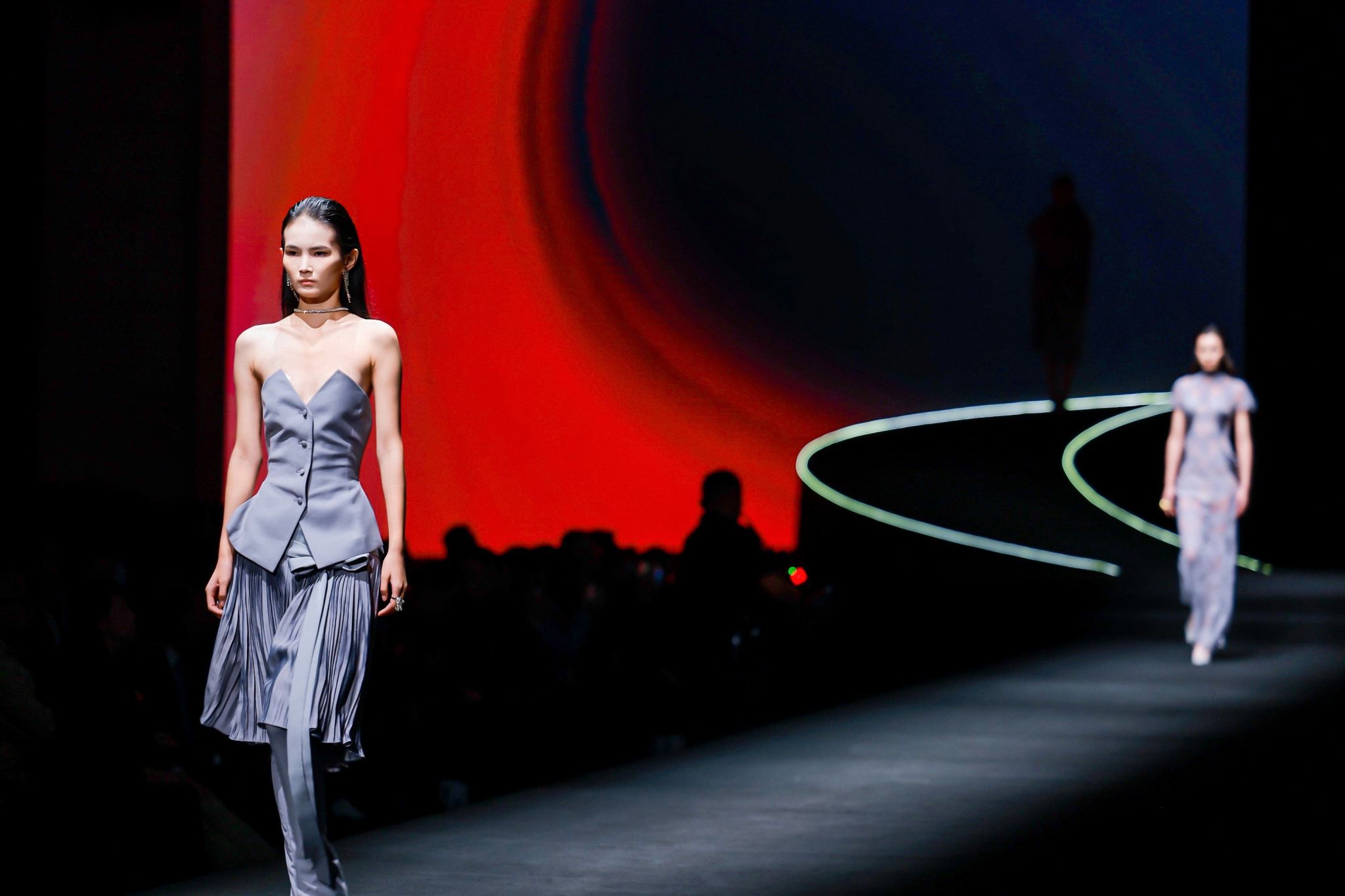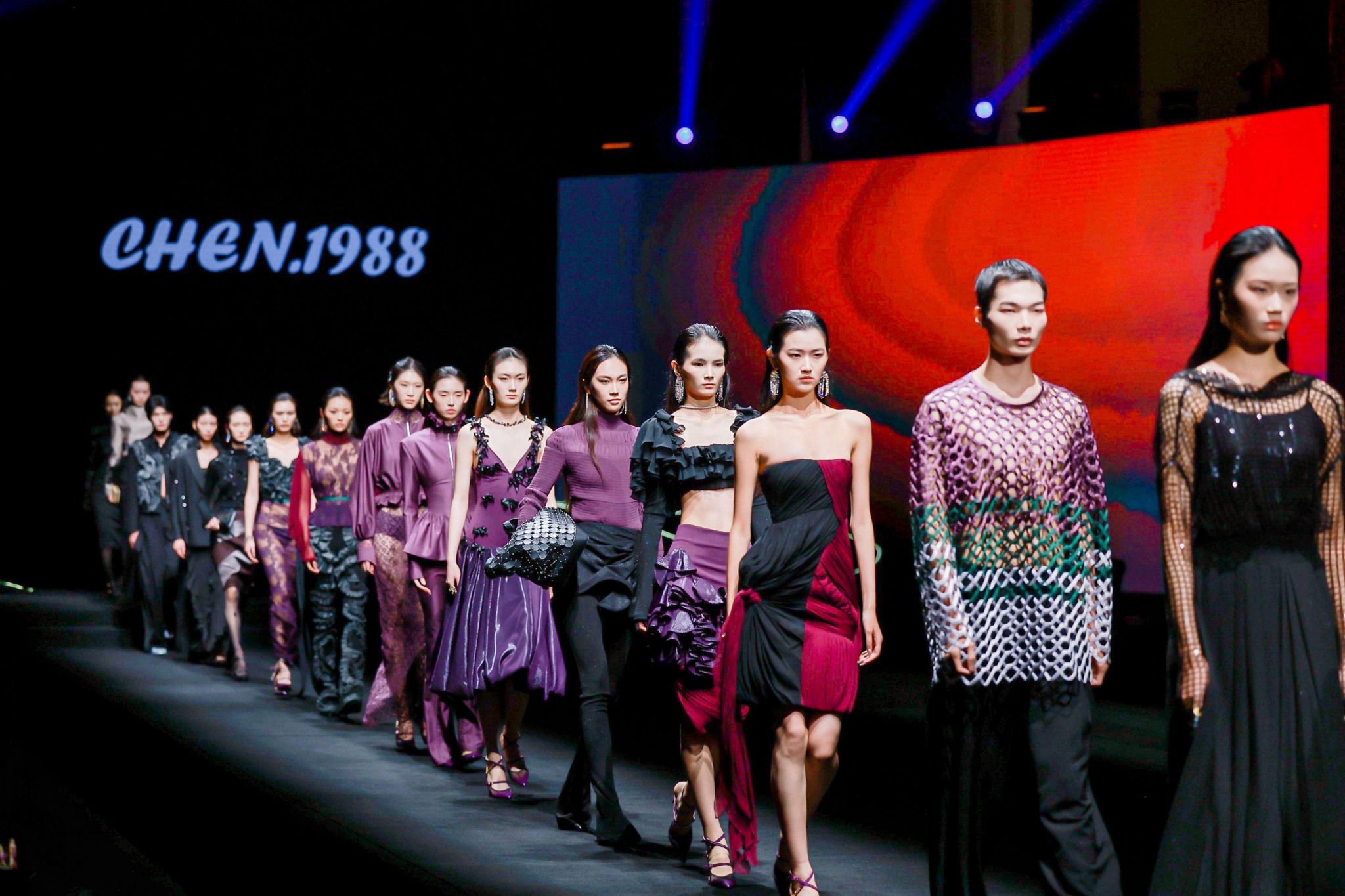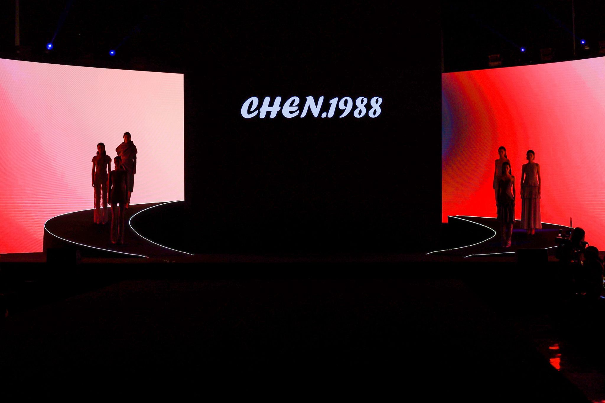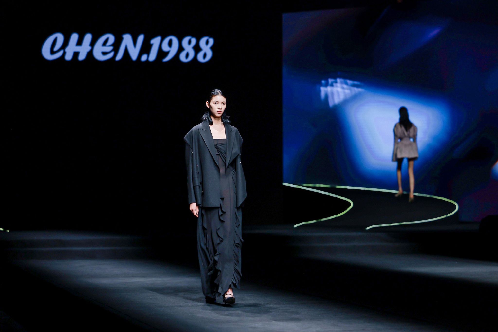 我校CHEN.1988 产业学院成果发布秀,使开幕式的氛围达到了高潮,为现场观众带来了一场极具创意的时尚视觉盛宴。本场发布会以“刚柔对话”为主题,将建筑般的硬朗结构与流动的柔美线条巧妙融合。在刚与柔的对话中,重塑了当代时装剪裁的边界。
