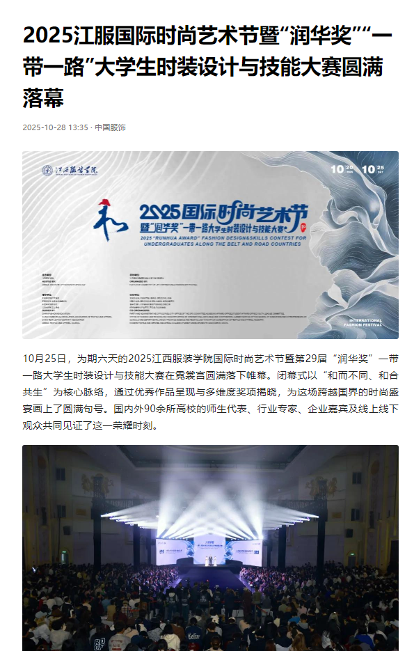 10月25日,为期六天的2025江西服装学院国际时尚艺术节暨第29届“润华奖”一带一路大学生时装设计与技能大赛在霓裳宫圆满落下帷幕。闭幕式以“和而不同、和合共生”为核心脉络,通过优秀作品呈现与多维度奖项揭晓,为这场跨越国界的时尚盛宴画上了圆满句号。国内外90余所高校的师生代表、行业专家、企业嘉宾及线上线下观众共同见证了这一荣耀时刻。