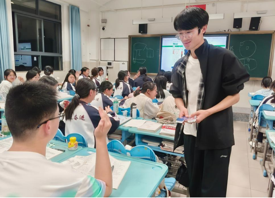 真站上讲台,原本藏在心里的一点紧张,很快就被学弟学妹们的热情冲散了。他们专注地倾听,踊跃地举起手提问,有人问起“大学的食堂”,有人好奇“东北的冬天”,我一一耐心解答;当他们接过书签时,脸上露出惊喜的笑容,那模样成了给予我们最好的回馈。是他们的纯真与热情,让我真切地感受到,所有的准备与奔波都如此值。我们带来的或许只是片刻的星光,但他们眼中闪烁的光芒,却照亮了我前行的路,让我更坚定了作为教育火种传递者的使命。