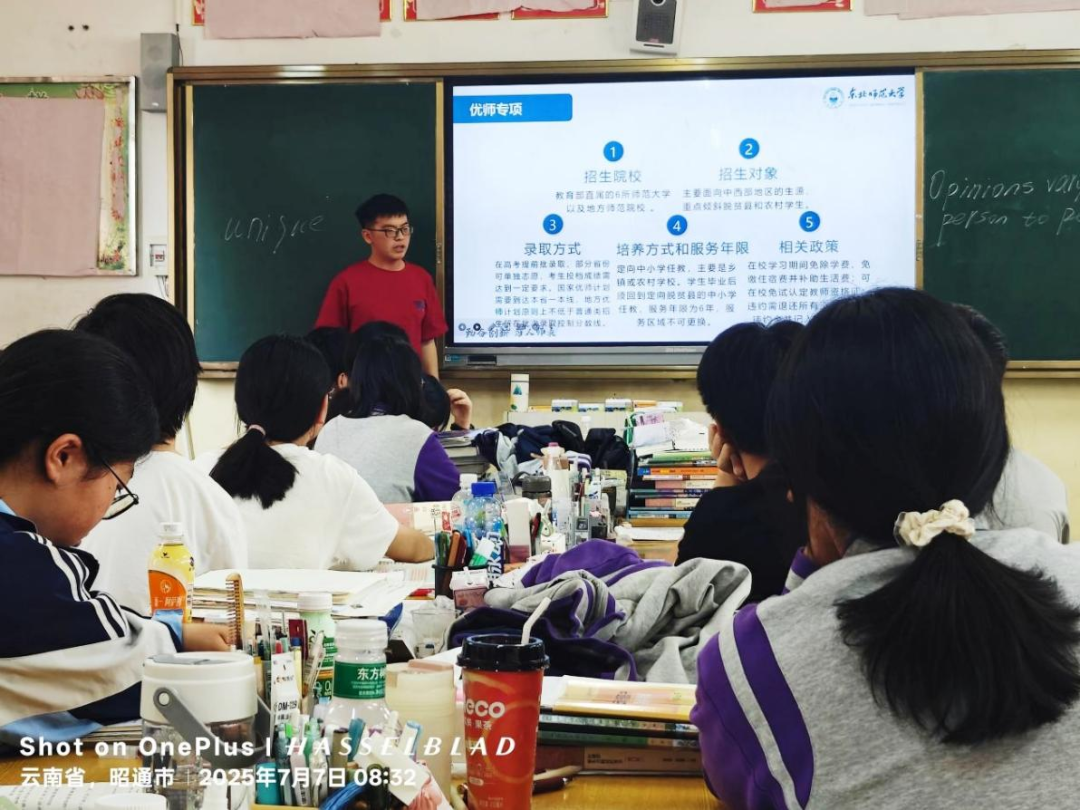 七月的昭通,云岭山的轮廓映在镇雄中学的窗户上。活动当天,在以往熟悉的教室里坐满了高一学生。我抱着厚厚的资料走进教室,手里是我整理了一周的“东师报考指南”,每一个数字都标上了注解。我以一张老照片开场——1946年延安窑洞中的东北大学旧址,学生们惊讶于“原来东师这么老”。当我转而展示净月校区图书馆的穹顶照片时,后排男生小声嘀咕:“这差距也太大了吧。”我顺势解释:“学校硬件在变,但‘为基础教育服务’的初心从未改变。”