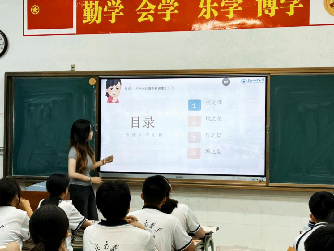 宣讲时,我顺着PPT的内容逐一向他们介绍东师,讲完后便进入提问互动环节,最后还一起拍了照留念。“学长,语文作文总写不好怎么办?”台下的提问让我瞬间想起自己的高中时光,于是我把语文作文谋篇布局的技巧、历史学科大历史观的思维训练方法逐一分享出来。互动中,我始终保持着即时的眼神交流,生怕错过他们的任何一个疑问。有的人好奇大学生活累不累,我笑着举了自己的例子:“之前做社会实践时,熬夜改报告到很晚,但看到成果的那一刻,比高中解出压轴题还开心。”
