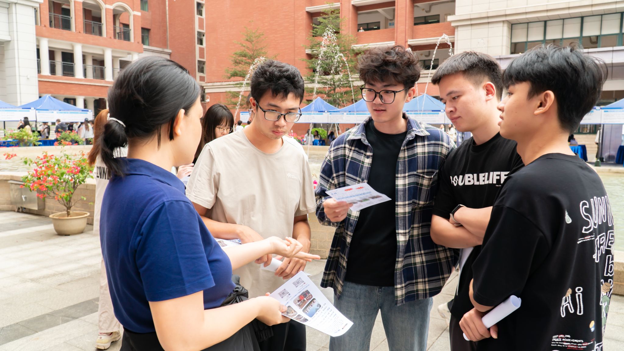 【校领导罗泳通(左三)、岳巧云(左二)在现场了解招聘活动情况】