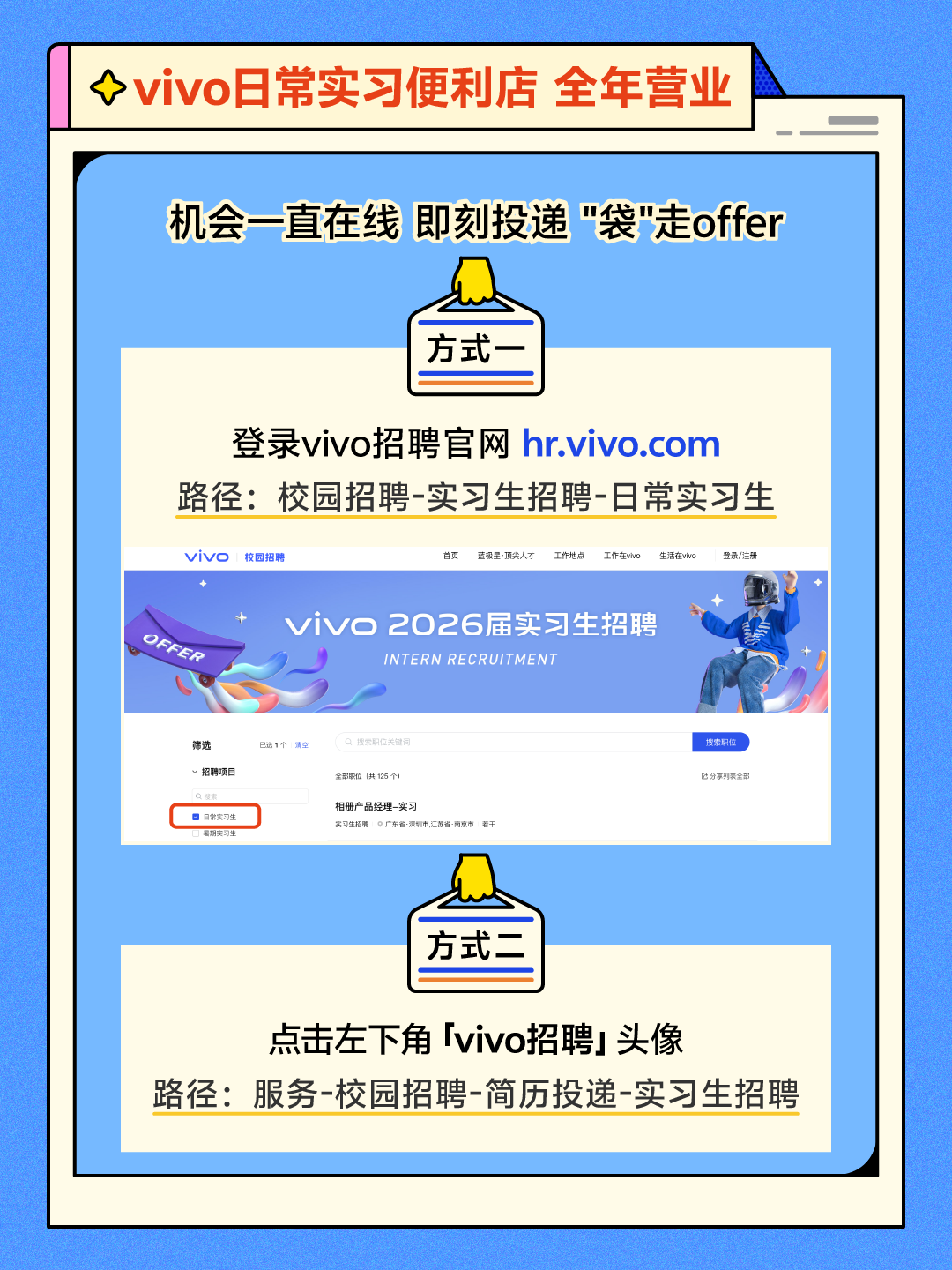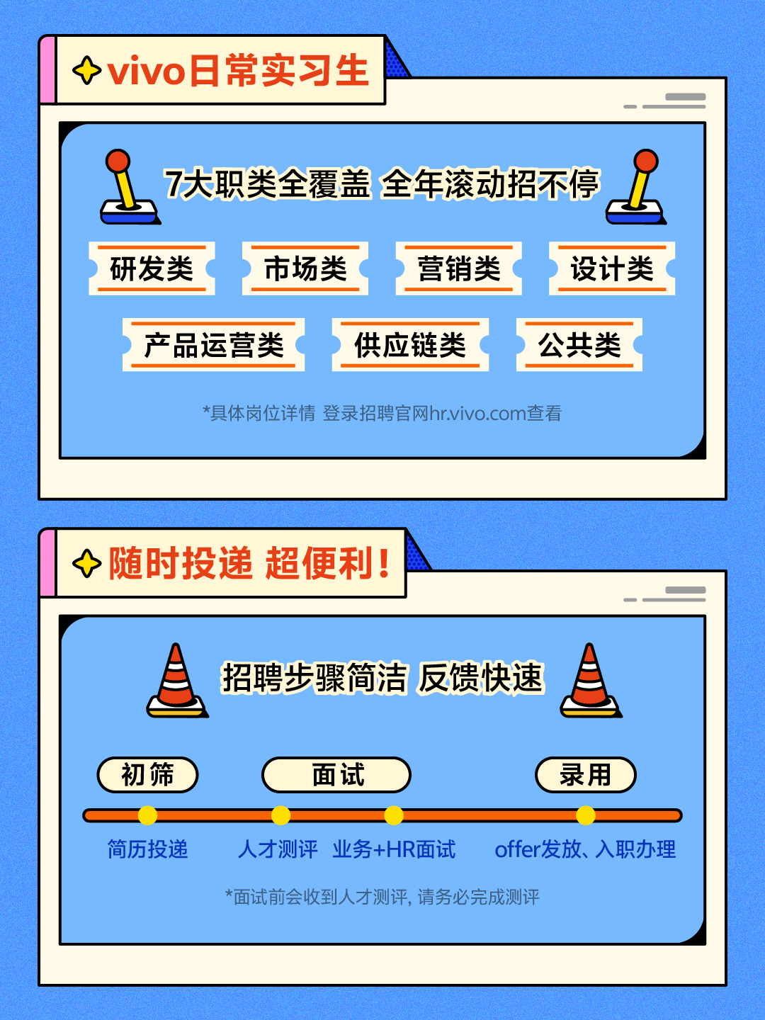 vivo 日常实习岗位全年持续更新,机会不打烊~随时投递,三步拿offer,超便利!!!🏳️🌈毕业时间2025年12月及以后的全球高校在校生💡职位类别研发、市场、营销、设计、产品运营、供应链、公共💙投递路径vivo招聘官网 hr.vivo.com校园招聘-实习生招聘-日常实习生
