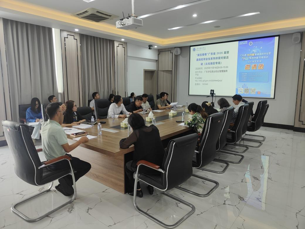 为迎接2025年11月18日在我校举行广东省2026届高校毕业生系列供需见面活动(从化地区专场), 2025年10月31日上午,我校在校长办公楼三楼会议室召开了“就在南粤”广东省2026届普通高校毕业生系列供需对接活动(从化地区专场)协调会。学校党委副书记、纪委书记张广金出席了会议,各二级学院、行政部门负责人及各学院毕业工作相关负责人参加了会议。会议由招生就业处副处长林青映主持。