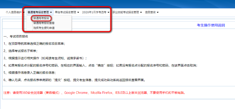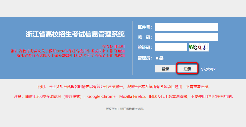 温馨提醒:考生注册的账号在浙江省高校招生考试信息管理系统考试项目通用,无需重复注册。报名时请使用电脑操作,建议使用360安全浏览器(兼容模式)、Google Chrome、Mozilla Firefox、IE8.0及以上版本浏览器,不要使用手机和平板电脑。
