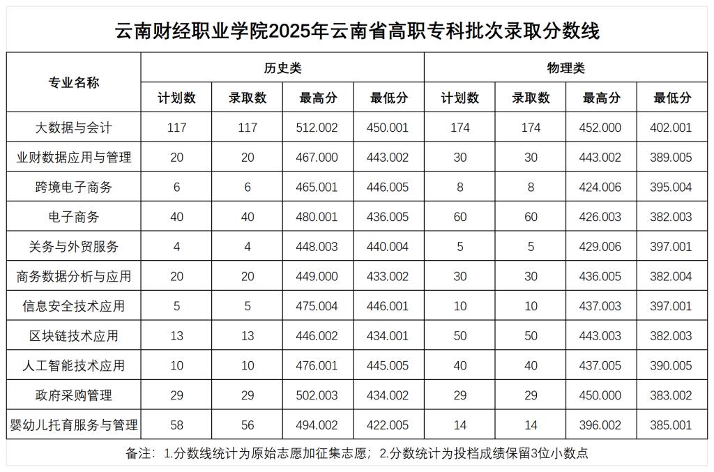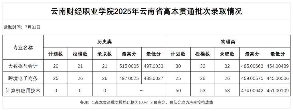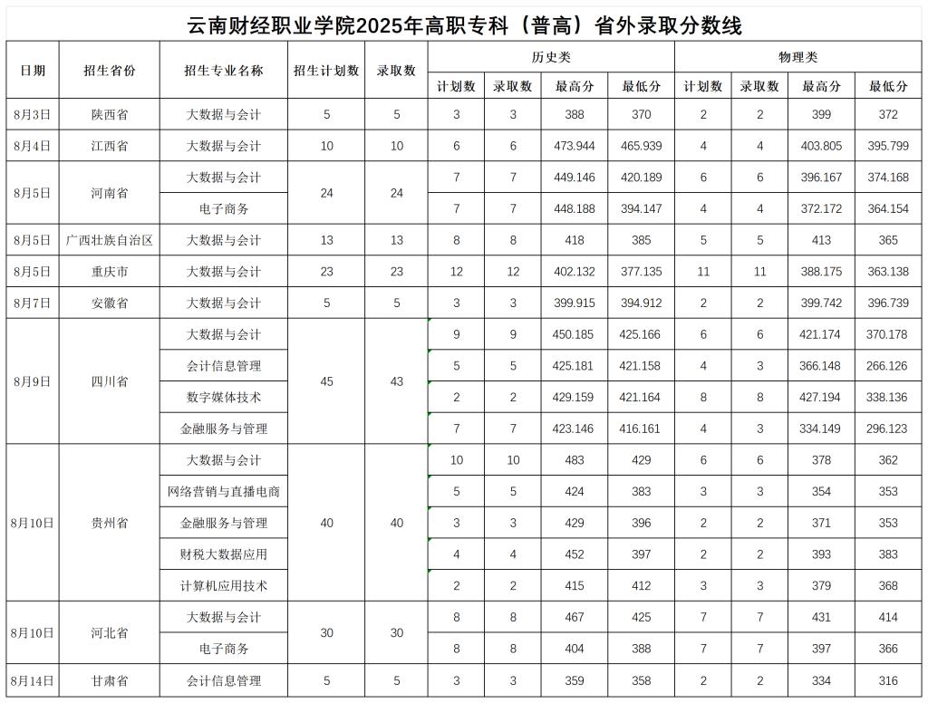 云南财经职业学院2025年高职专科录取情况