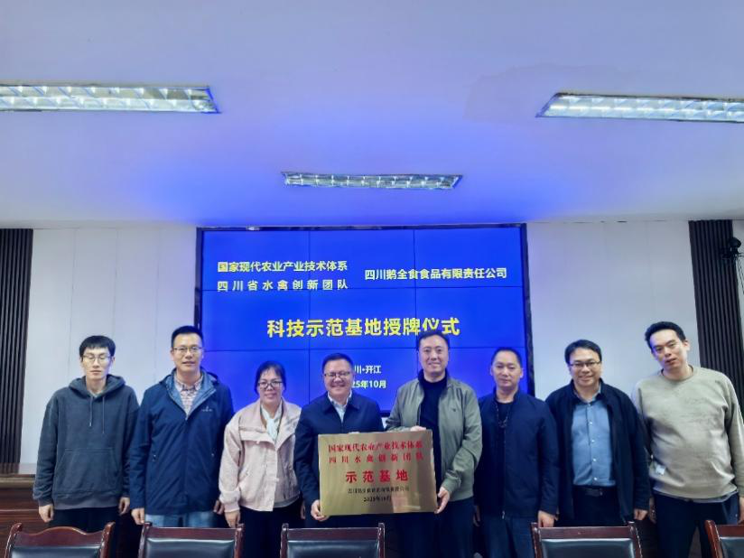 专家团队首先调研了开江县四川鹅全食食品有限责任公司和周边多个种鸭和商品肉鸭养殖场,针对肉鹅核心育种场和开江麻鸭原种场的场地建设、品种选育、种禽均衡产蛋、种蛋受精与孵化率提升、饲养管理与疫病防控等技术问题进行了现场指导。充分调研后,与开江县畜牧业发展服务中心、相关企业和养殖户进行了座谈交流。针对该县开江麻鸭、四川白鹅“两只禽”特色品种全产业链发展现状及科技创新需求进行了交流和合作研讨。同时,团队与四川鹅全食食品有限责任公司共建“国家现代农业产业技术体系四川水禽创新团队示范基地”,并举行了授牌仪式。