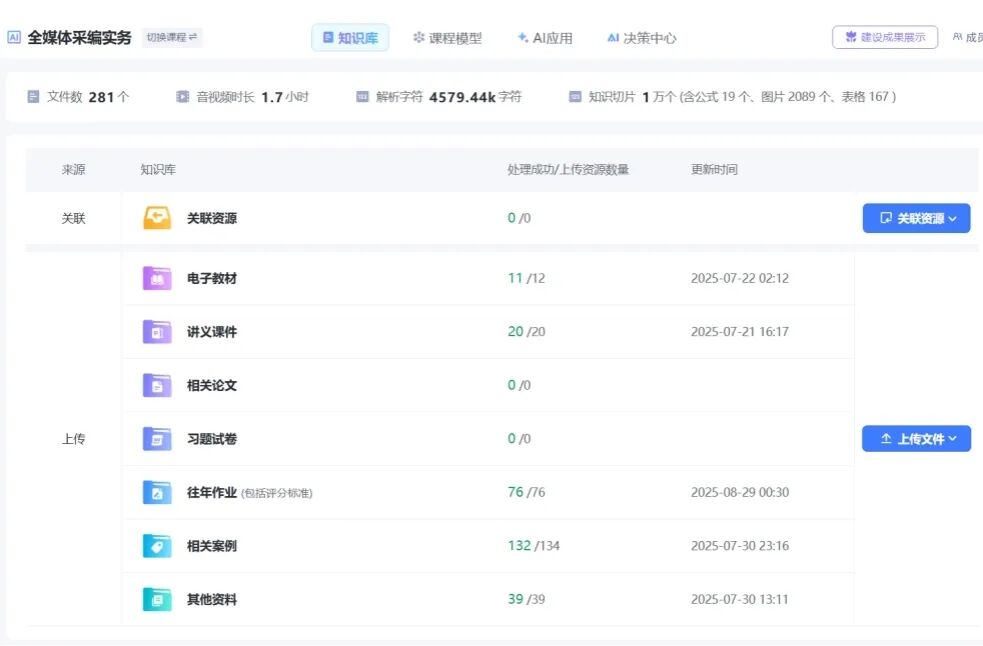 学校打出“培训+督导”组合拳,连续举办多场覆盖全校所有教学单位的专题培训和实操工作坊,内容涵盖智慧教学基础应用和AI赋能课程改革等前沿主题。同时建立常态化督导检查机制,通过平台数据监测、随机听课等方式,确保改革取得实效。技术赋能:AI驱动课程建设亮点纷呈在完成全新智慧教学平台的使用培训后,全校教师热情高涨,迅速投身于智慧课程建设工作,积极探索并运用平台的多样化功能,课堂变革在校园内蓬勃展开。教学资源实现知识化再造。《全媒体采编实务》课程团队利用人工智能技术,对传统的教材、课件、案例等散点化资源进行系统性整合与深度解析,构建起结构化专属知识库。这不仅为AI应用提供了丰沃的数据土壤,更实现了知识点的精细化切片与管理,为后续的个性化学习推荐奠定了坚实基础。
