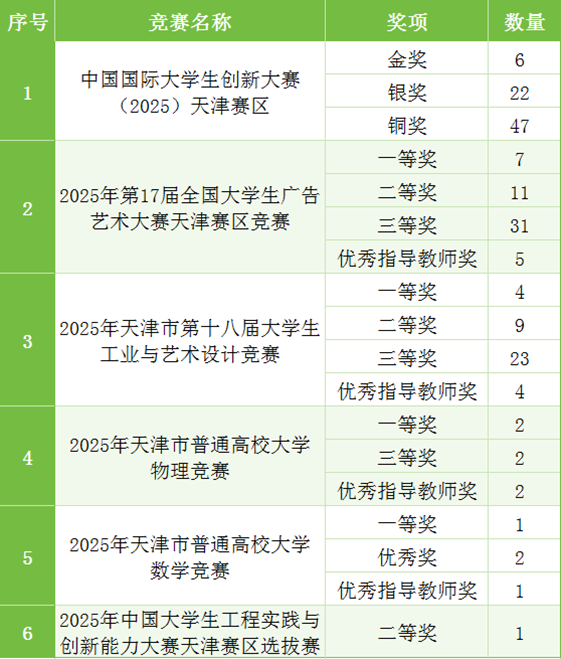 近日,天津市教育委员会公布了2025年上半年中国大学生工程实践与创新能力大赛天津赛区选拔赛等9项学科竞赛的获奖名单,我校学子凭借扎实的专业功底、卓越的创新能力与紧密的团队协作,在多个赛事中表现突出,斩获颇丰,充分展现了我校创新人才培养的丰硕成果。