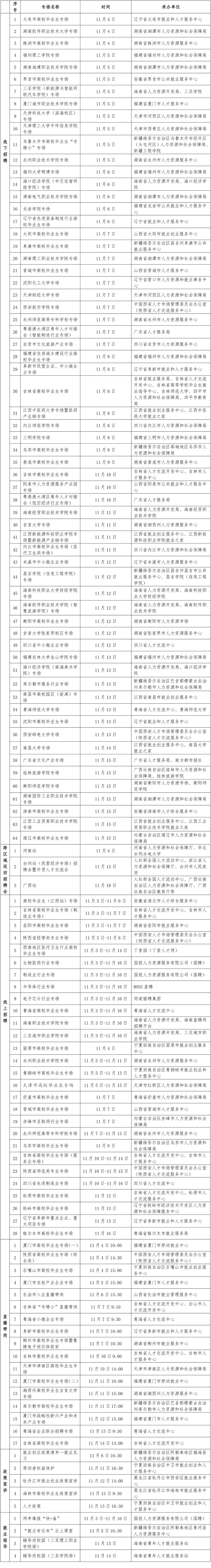 人力资源社会保障部职引未来——2025年全国城市联合招聘高校毕业生秋季专场推出第四批特色服务活动,包括92场面向先进制造、现代服务、医疗卫生、文化旅游等重点行业,以及西南地区、粤港澳大湾区等重点区域的线上线下专场(校园)招聘会,3场跨区域巡回招聘会,17场直播带岗活动和9场政策宣讲、就业指导直播(录播)课等,组织“专而精”“小而美”专项招聘,重点推进就业服务活动进校园,为高校毕业生提供有针对性的多元化就业服务支持。