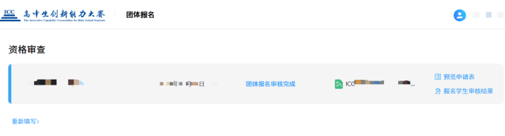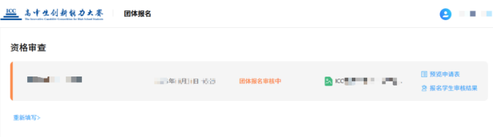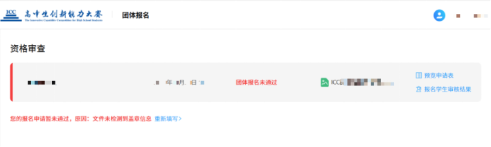 8.若团体审核未通过,原因会以短信形式发送至大赛负责人注册时使用的手机号。若有需要更改的信息,点击“重新填写”即可修改。例如上传文件未加盖公章或未上传有效文件,系统会自动识别并退回申请,认定为报名未通过,需重新提交报名表。