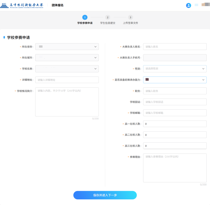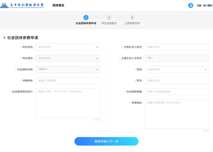 4.进入“团体报名”页面后,按要求将团体信息及大赛负责人信息填写完整,点击“保存并进入下一步”。