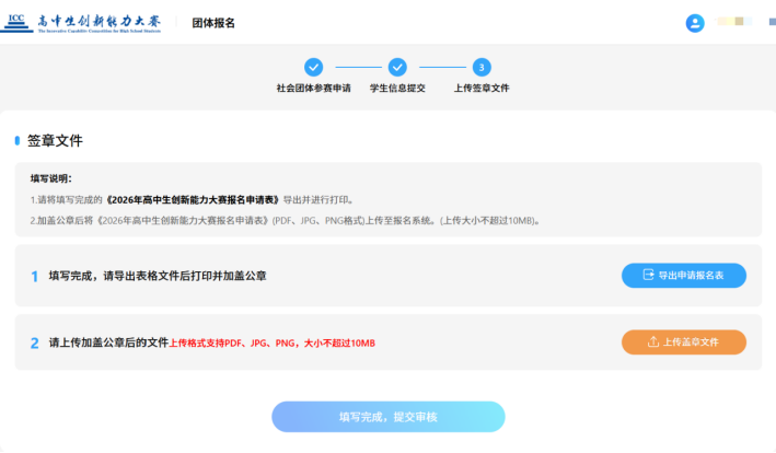 7.进入下一步后,点击“导出申请报名表”,学校团体的报名表需校长签字并加盖公章,社会团体的报名表需加盖公章,然后点击“上传盖章文件”将报名表上传至系统中。
