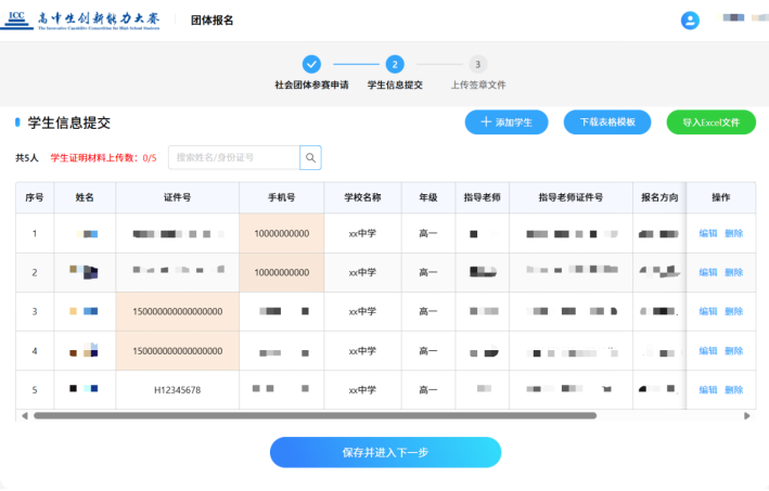 6.导入学生信息后,系统将自动识别表格内容进行处理。若导入信息有误,该信息表格将会被标记且无法进行下一步。若证件号输入错误,信息则无法被识别,可点击“编辑”修改信息或重新导入表格。添加或删除学生信息建议于Excel文件内进行修改并重新提交。(港澳学生须在“证件号”一栏填写港澳居民来往内地通行证号码,台湾学生须填写台湾居民来往大陆通行证号码。)