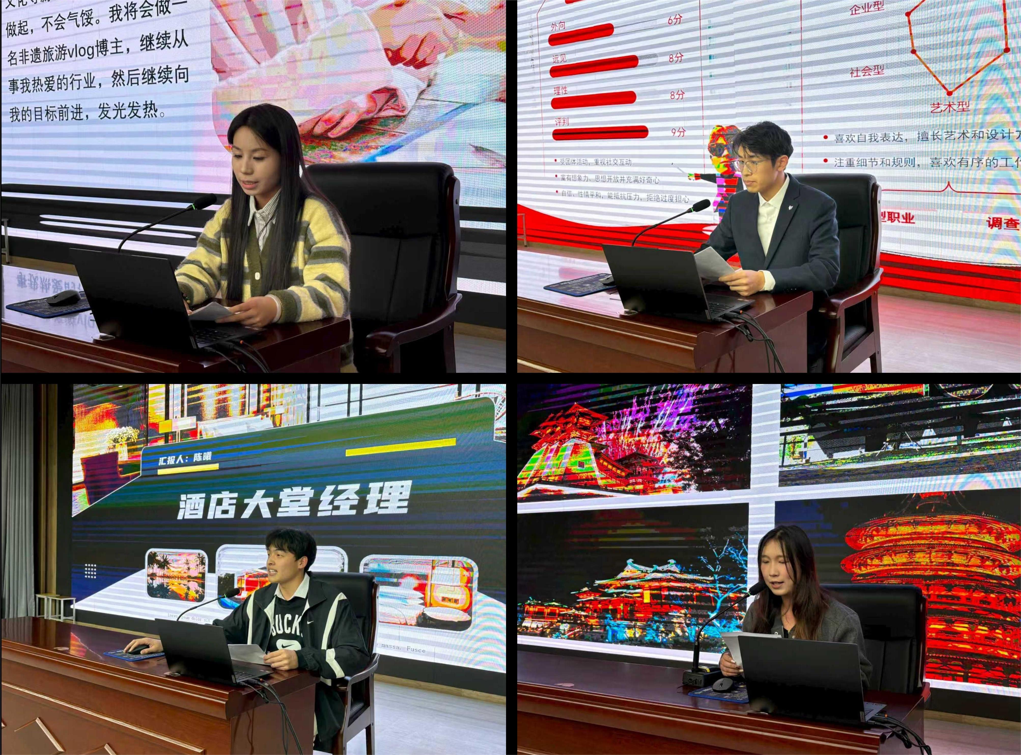 会议还安排了2024年校赛金奖作品展示环节。园林园艺学院郑怡梦、旅游与食品学院刘亦菲、陈曦、艺术学院刘承鑫四位同学依次展示了他们的职业规划作品,为在场同学提供了宝贵的参赛经验。