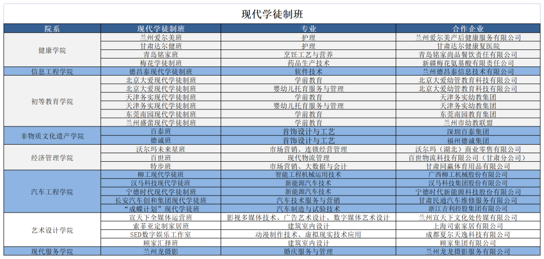 学院是甘肃省高水平高职学校建设计划A档建设单位,专业建设紧密结合市场和企业发展需求,数控技术、学前教育专业为国家级骨干专业;数控技术、学前教育、汽车检测与维修技术、动漫设计、现代物流管理、电子商务、机电一体化技术7个专业为省级骨干专业;模具设计与制造、电子商务、动漫设计等3个专业为省级教改试点专业;数控技术、动漫设计、汽车检测与维修技术3个专业为省级特色专业;有光伏工程技术与应用团队、汽车检测与维修技术团队、学前教育教学团队等11个省级教学团队。建成“汽车电子控制技术”等7门省级精品课程,有汽车发动机构造与原理等4门省级精品资源共享课。综合物流实训、课件制作等18门省级在线精品课程。获得“依托校企校研合作平台构建光伏特色专业模式”等12项省级教学成果奖。学院共有物流管理、传感网应用开发等24个“1+X证书”试点项目。学院还成立省内首家非物质文化遗产学院,着力培养具有新时代工匠精神和创新创业能力的非遗传承人。