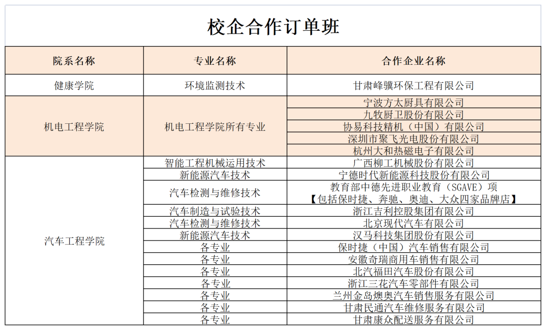 学院与德国BOSCH(博世)、麦特奔腾、费斯托(中国)、巴斯夫、奔驰、陆科斯德等知名企业深度合作,与汉斯·赛德尔基金会共建培训中心,共同开展汽车专业建设和人才培养和培训。信息安全与管理专业成为甘肃省在高等职业院校中开设的首个网络空间安全一级学科下的专业。兰州市网络安全学院落户学院。与华为技术有限公司、甘肃九霄鲲鹏科技有限责任公司建设的甘肃省首个鲲鹏产业学院落户学院。与安德控股(香港)有限公司开始跨境电商大学生(双创)产业园的战略合作。