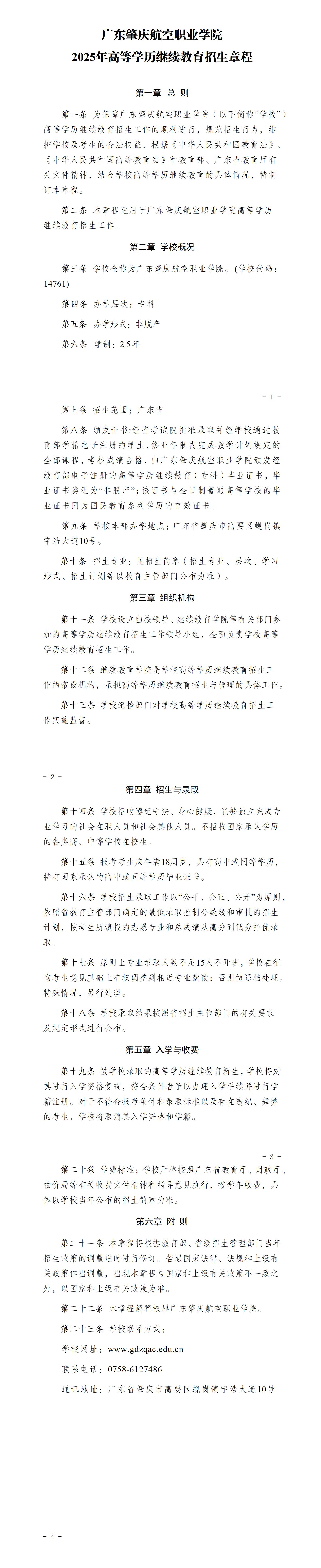 广东肇庆航空职业学院 高等学历继续教育招生章程