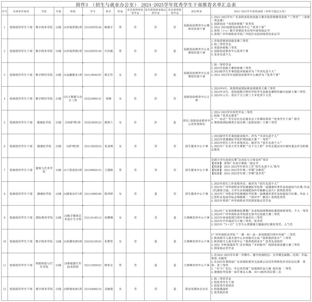 为激励先进、树立典范,根据《广州华商职业学院学务部华职学﹝2025﹞30号》文件的具体要求和相关通知精神,经学生干部自主申请、为更好地为学校的建设和发展服务,招生与就业办公室评议小组严格审查并进行研究讨论,现将2024-2025学年优秀学生干部评选结果予以公示(具体名单如下)。