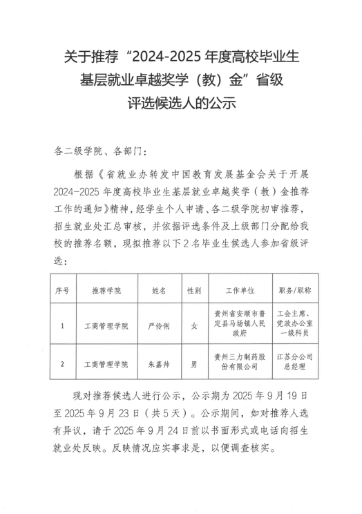 关于推荐“2024-2025年度高校毕业生基层就业卓越奖学(教)金”省级评选候选人的公示