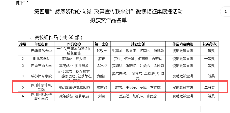 近日,在四川省教育厅主办的第四届“感恩资助心向党,政策宣传我来讲”微视频征集展播活动中,由新媒体学院学生团队赖南妃、赵庆、王怡斐、罗濛、李雅蝶共同创作的《资助政策护航成长路》荣获高校组二等奖。