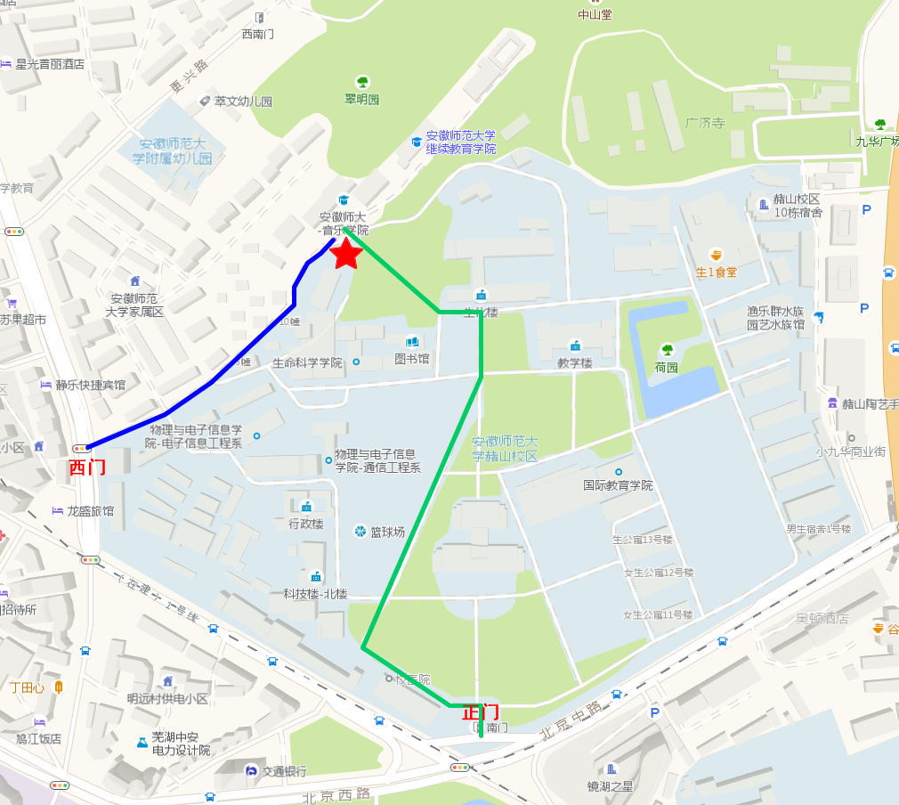声乐、器乐和视唱考试地点:安徽师范大学赭山校区(芜湖市北京中路2号)音乐学院。考生应按本人准考证中规定的考试时间,携带准考证和身份证提前60分钟从安徽师范大学赭山校区西大门(中山北路49号)进入校园,提前30分钟到达音乐学院考场入口处。