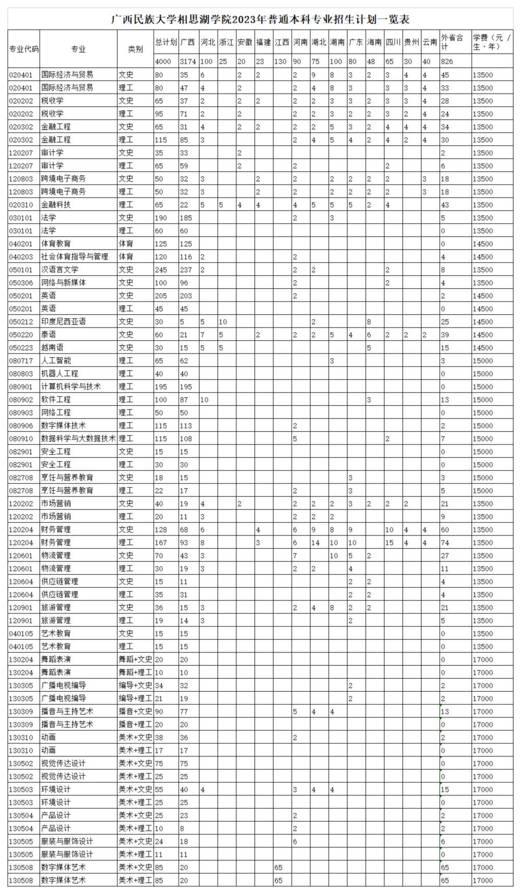 广西民族大学相思湖学院2023年普通本科专业招生计划一览表