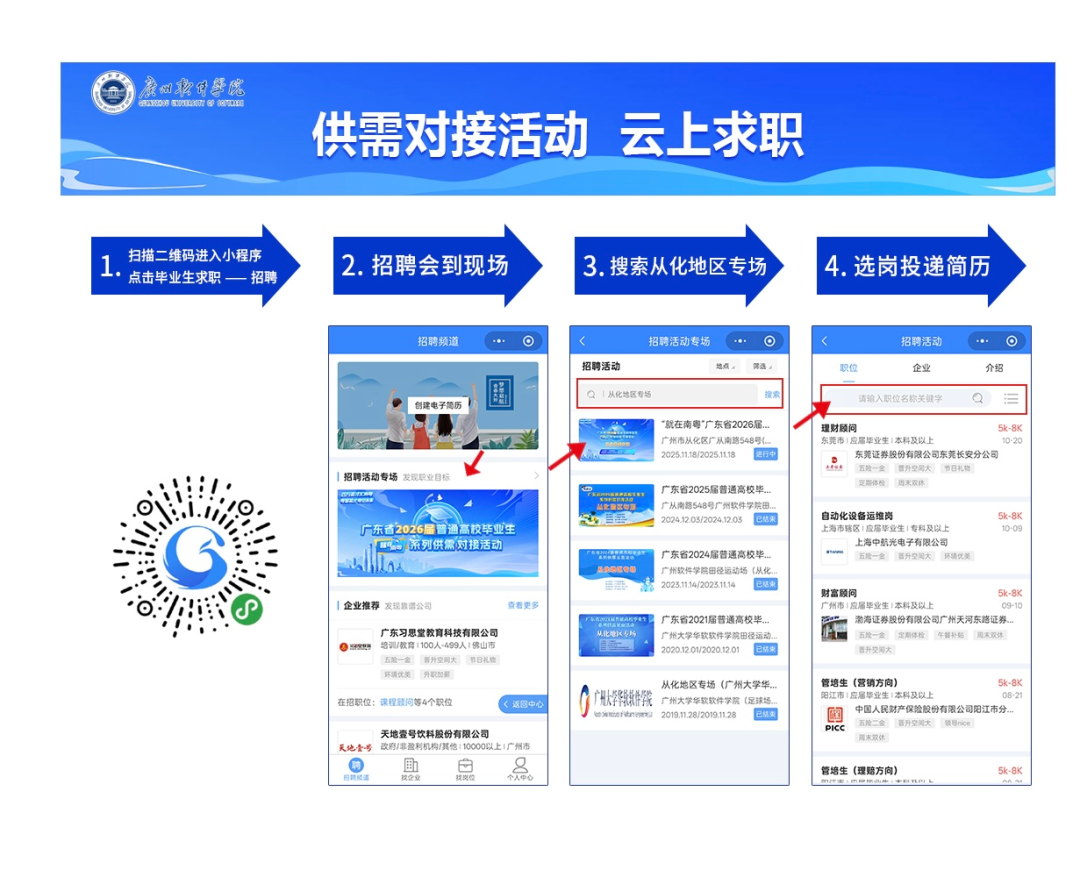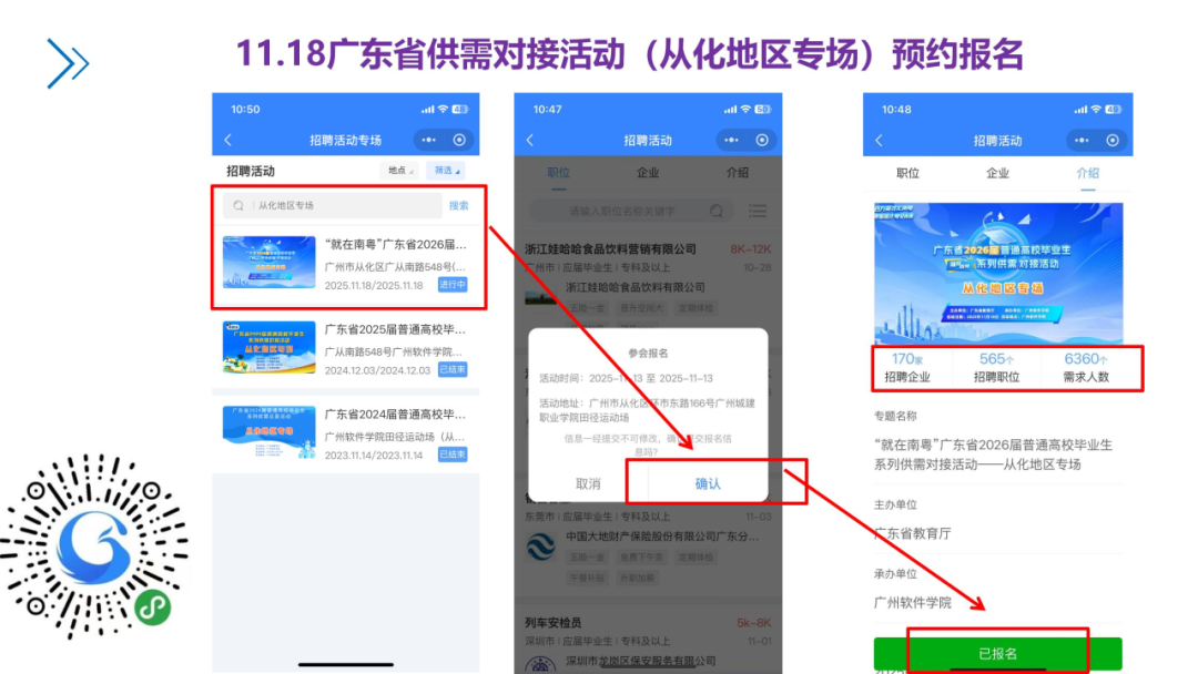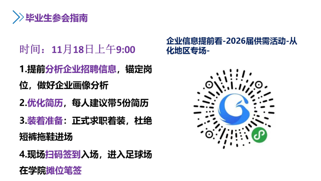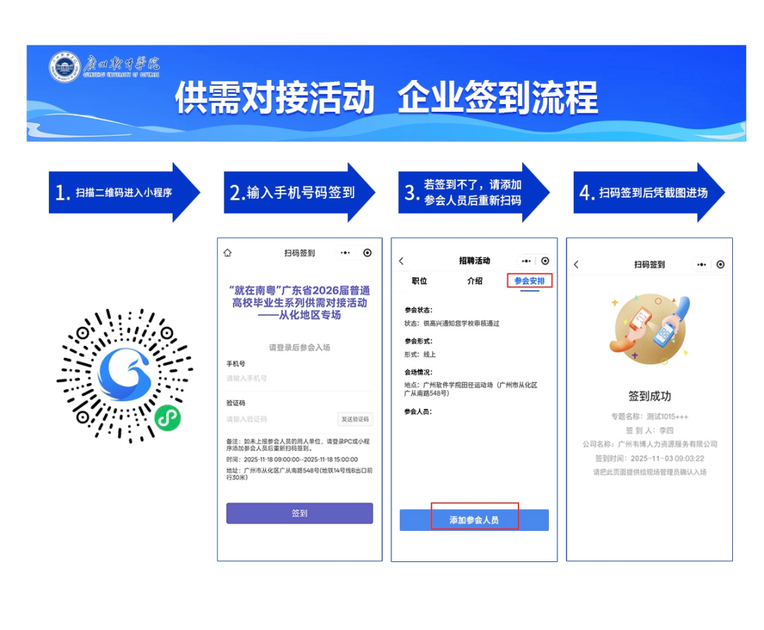 使用微信扫一扫,扫描下方二维码可进入“广东大学生就业创业企业端”小程序签到页面。扫码签到成功后可以截图保存,现场出示截图完成快速签到(为避免现场签到时间过长排队等候,建议提前完成该步骤)。上午8:00-9:00凭营业执照复印件或企业工作证、身份证等身份证明办理入校核验报到手续;