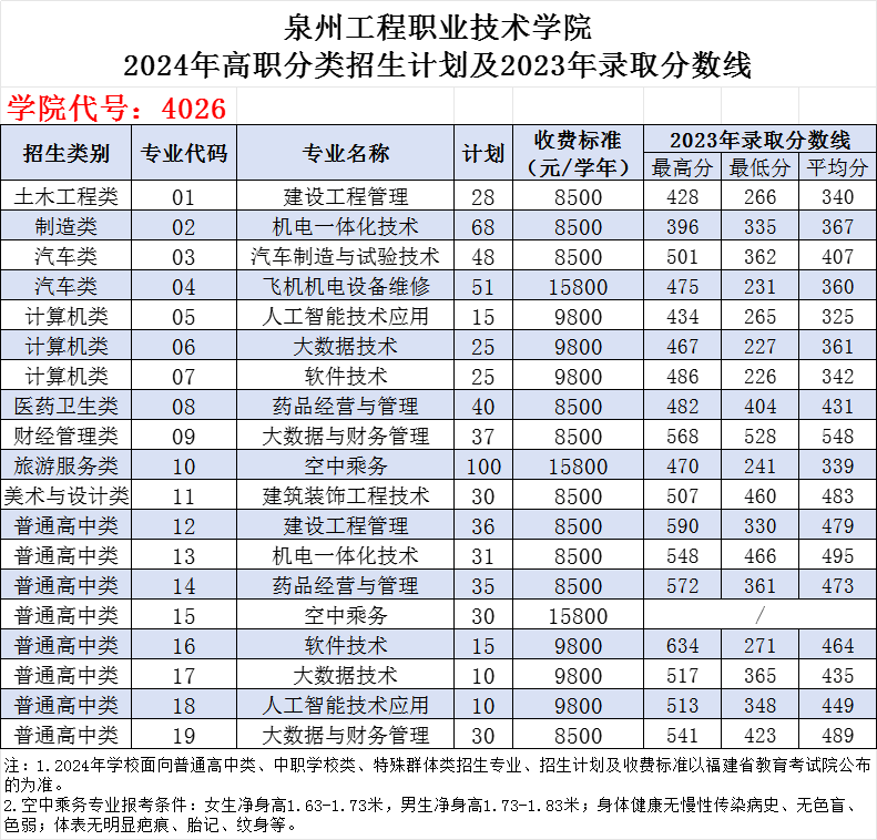泉州工程职业技术学院2024年高职分类招生计划及收费标准