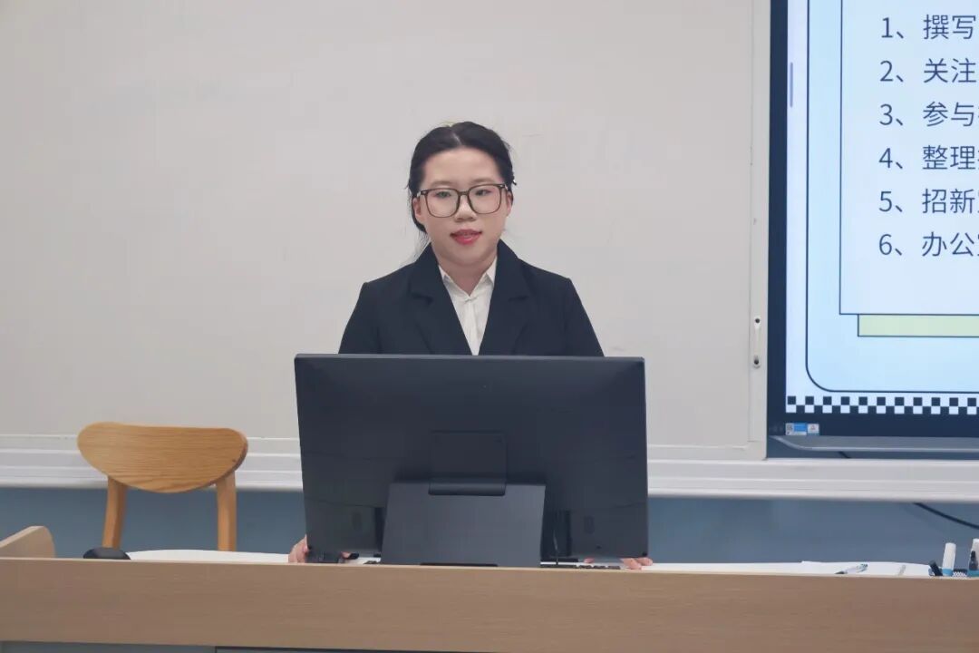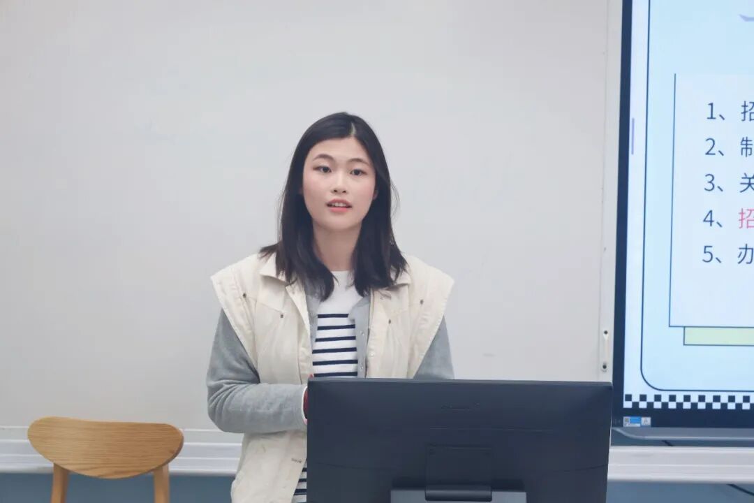 文宣部、运营部、新媒体部负责人依次介绍各部门的工作内容。文宣部部长郑尤莉详细介绍了“上经贸大本科招生”微信公众号的文案内容和风格,强调文案撰写在招生宣传中的关键作用。运营部部长喻王玮聚焦微信公众号排版与内容发布,展示了过往优秀推文案例,并鼓励成员在实践中提升排版审美与操作技能。新媒体部部长陈婷悦则系统介绍了招宣协的海报设计、活动摄影、视频剪辑等重要工作。