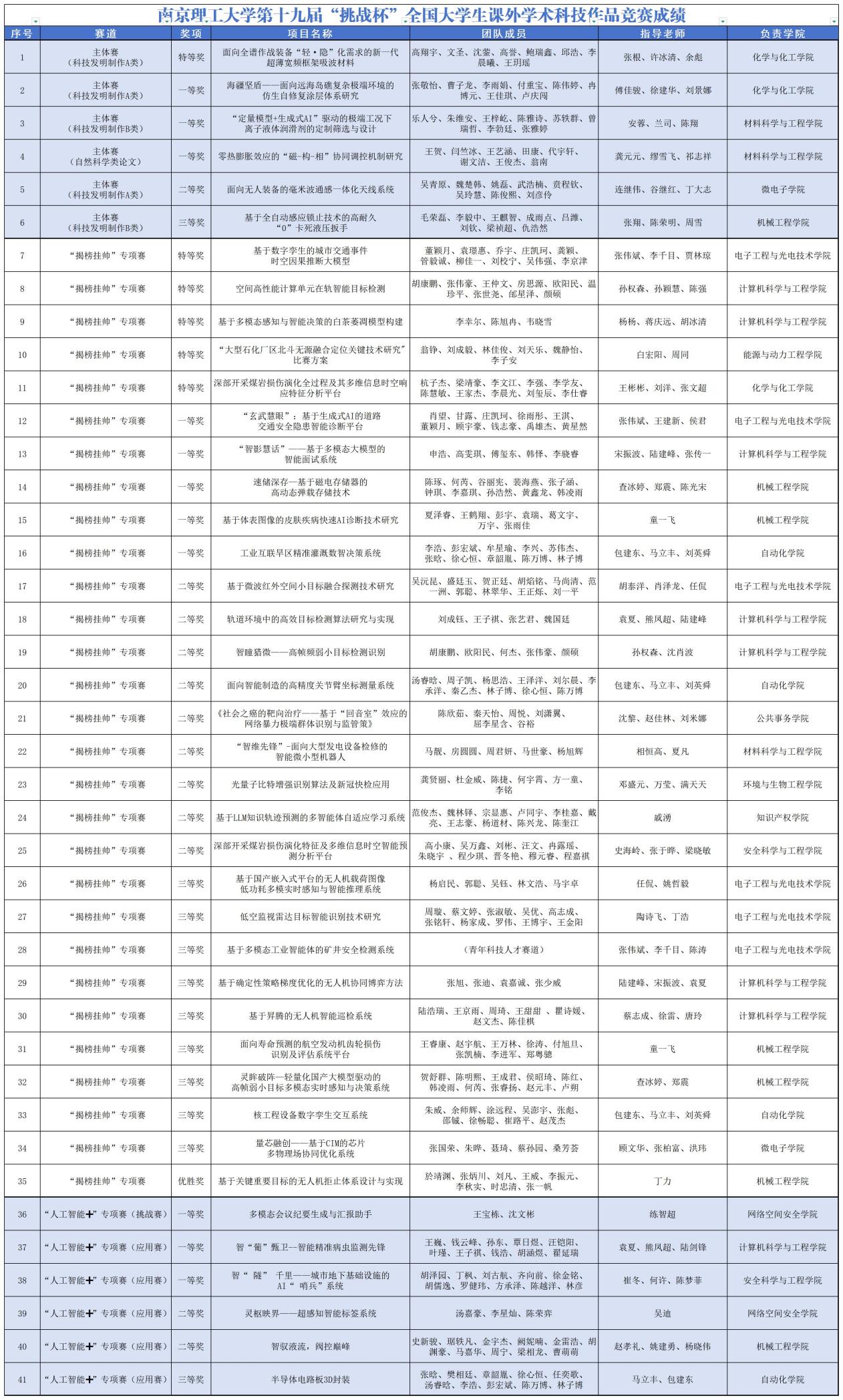 11月1-3日,第十九届“挑战杯”全国大学生课外学术科技作品竞赛全国总决赛在南京大学举办。我校6件主体赛作品,经过激烈角逐,获得特等奖1项(授奖比例前3%)、一等奖3项(授奖比例前10%)、二等奖1项,特一等奖总数位居全国高校第8,工信七校第2(仅次于北航)、江苏高校第2(仅次于东道主南京大学),也是我校继2015年荣获“挑战杯”之后在“大挑”竞赛中取得的历史最好成绩。学校被团中央授予“优胜杯”。