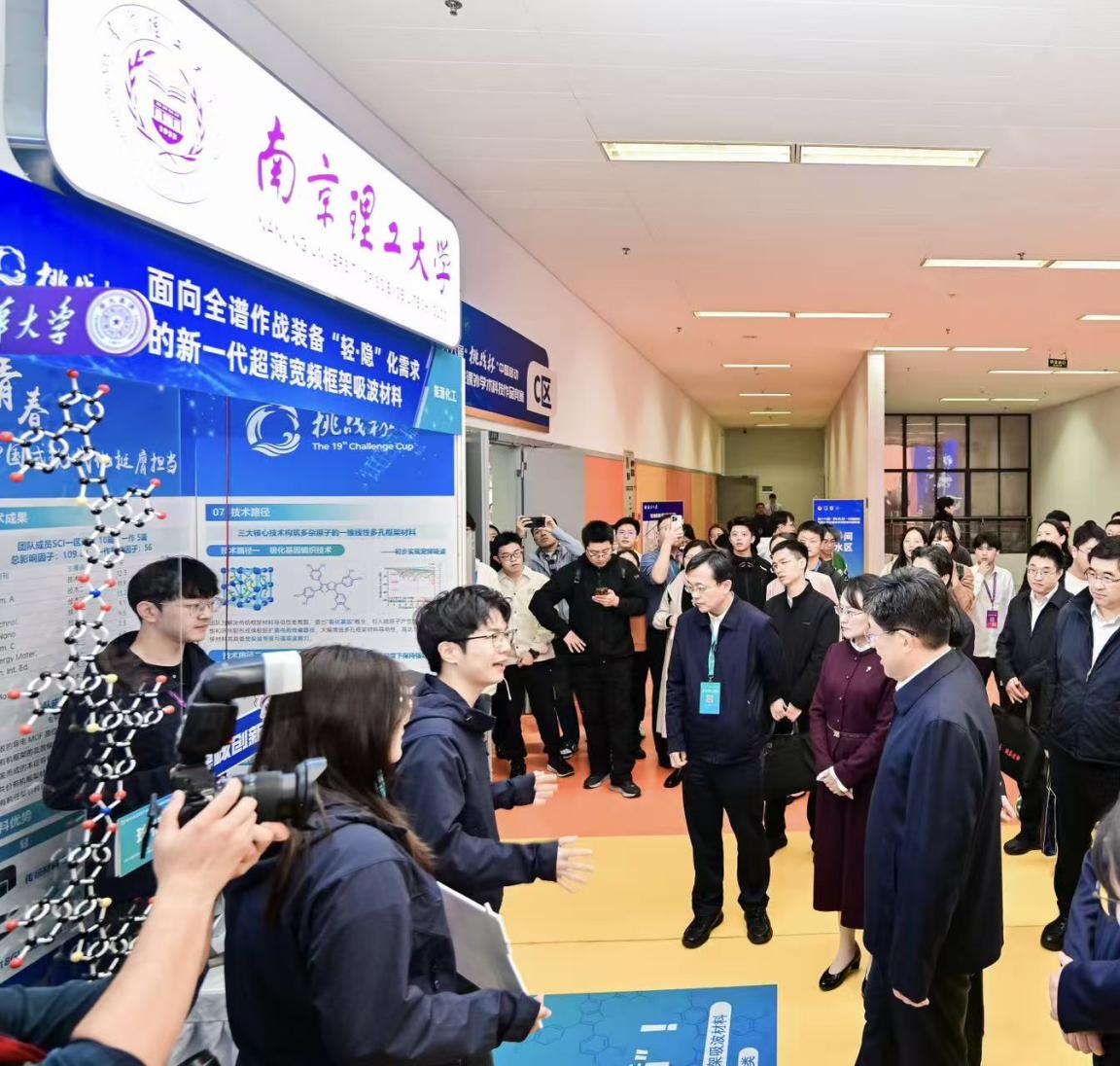 闭幕式前,共青团中央书记处第一书记阿东现场观摩了全国大学生“挑战杯”优秀项目展,其中包括我校特等奖作品化学与化工学院项目《面向全谱作战装备“轻·隐”化需求的新一代超薄宽频框架吸波材料》,团队负责人展示了科创作品的科学性、先进性和现实意义。