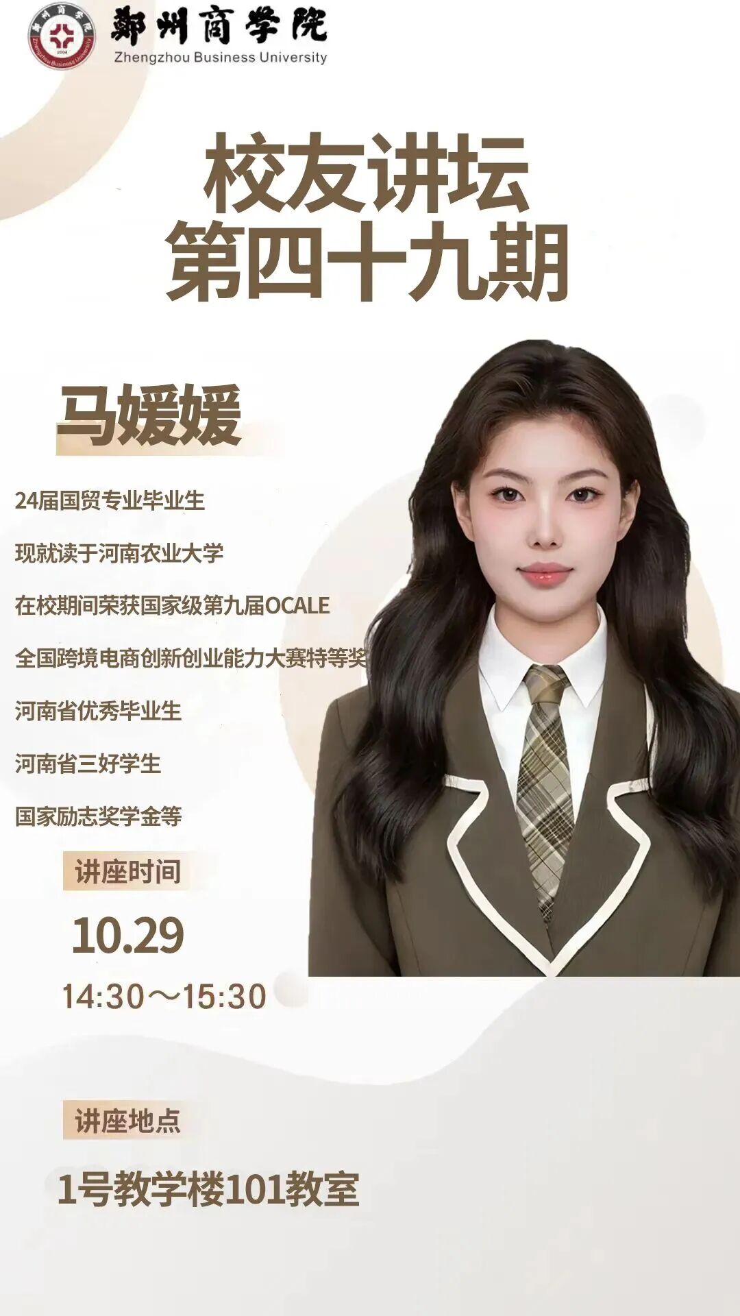 10 月 29 日,由招生就业处主办、金贸学院承办的校友讲坛第四十九期在 1 号楼 101 教室顺利举行。本次讲坛聚焦考研备考关键问题,特别邀请 2024 届国际经济与贸易专业毕业生马媛媛返校,为在校学子开展考研专题答疑分享,助力同学们破解考研困惑,明确备考方向。