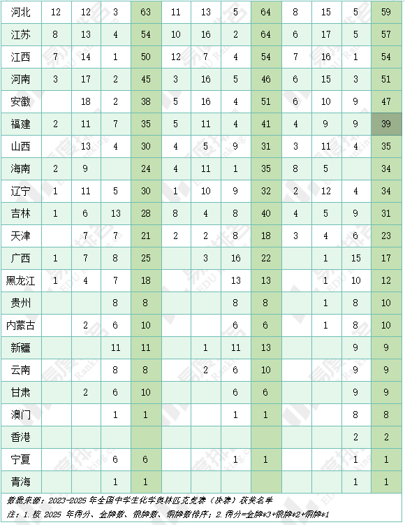 近日第39届中国化学奥林匹克竞赛(决赛)在合肥圆满闭幕,本届竞赛共产生608枚奖牌。本文将根据近三年的竞赛获奖名单分析各省、各中学化学竞赛实力变化情况。