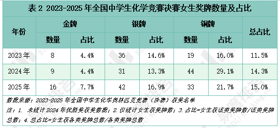 男生在化学竞赛中更具优势,但近两年获奖者中女生占比持续提升,2025年共有91位女生获得奖牌,占总获奖人数的15%。其中金牌获得者女生占比上涨最为明显,2025年金牌获得者中女生达到16位,较2023年增长了一倍,其占比上升至7.7%。