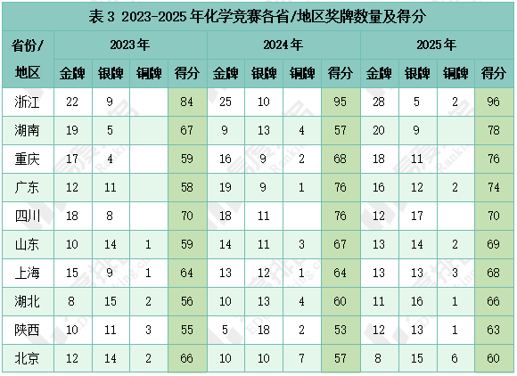 浙江省化学竞赛实力超群,近年获得的金牌数量及奖牌得分始终位居第一,今年浙江共获得28枚金牌,远超其他省份。