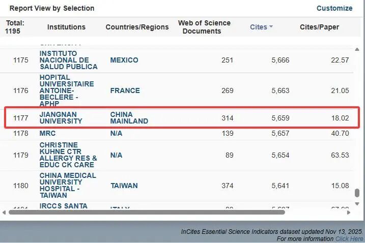 其中农业科学为ESI排名前万分之一的学科、化学和工程学为ESI排名前千分之一的学科。目前,江南大学在ESI学科榜单上位列全球第424位,与2024年11月排名相比进步74位。江南大学相关学科“量”、“质”协同跃升,全球学术影响力均达到新高度。