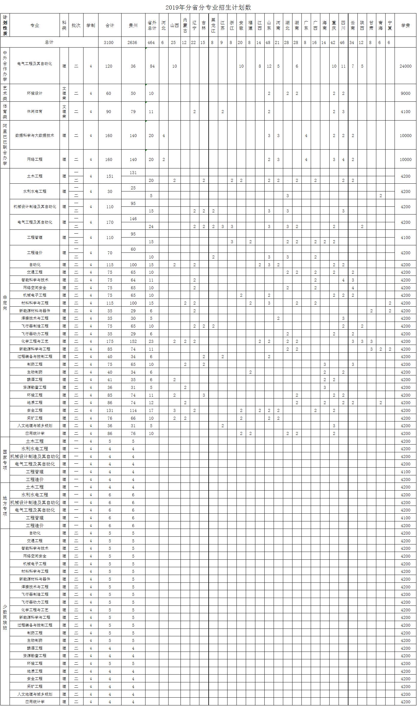 贵州理工学院2019年分省分专业招生计划一览表