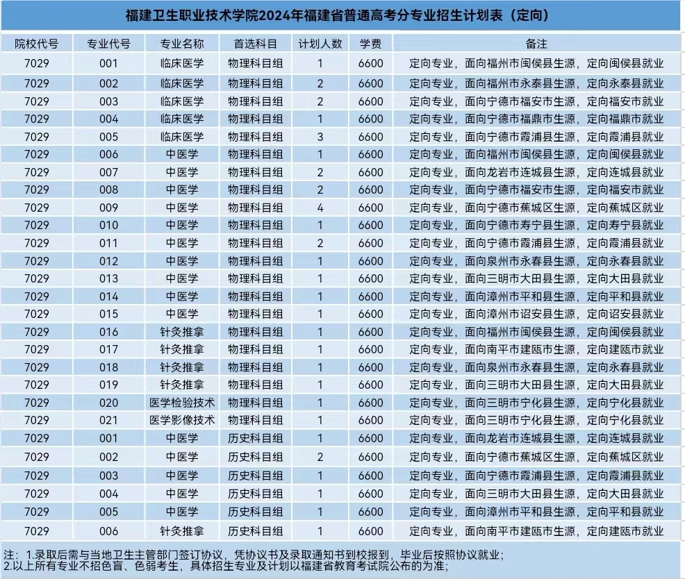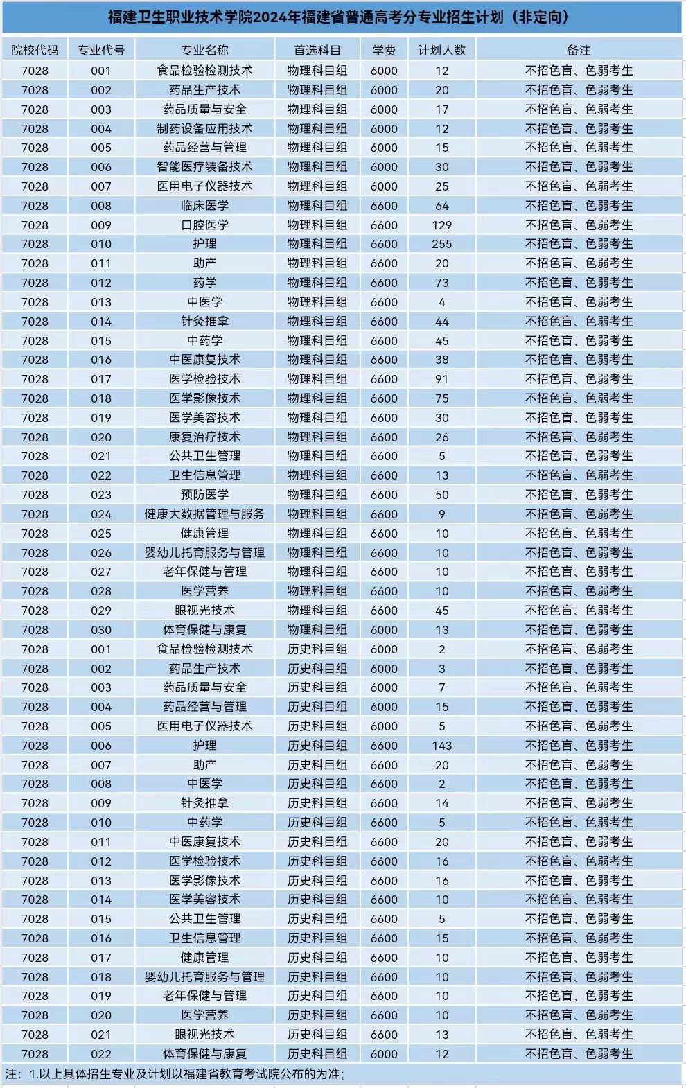 福建卫生职业技术学院2024年福建省普通高考分专业招生计划