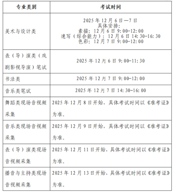 (2)艺术类专业省级统考笔试科目安排在2025年12月6日至7日进行,现场音视频采集科目于2025年12月8日开始。具体安排如下表: