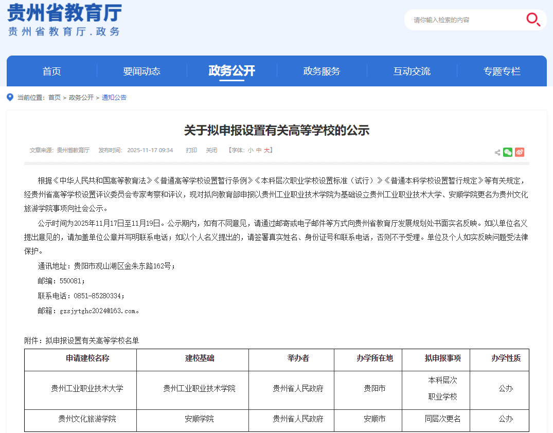 近日,贵州省教育厅发布重磅公示:以贵州工业职业技术学院为基础,正式申报设立贵州工业职业技术大学!这所扎根贵州工业67年的公办院校,从1958年的贵州省化工学校起步,历经高职升格、示范校建设,如今迈入职业技术大学行列,标志着其在高素质技术技能人才培养领域的实力获得权威认可,也为贵州产业升级注入更强教育动能。